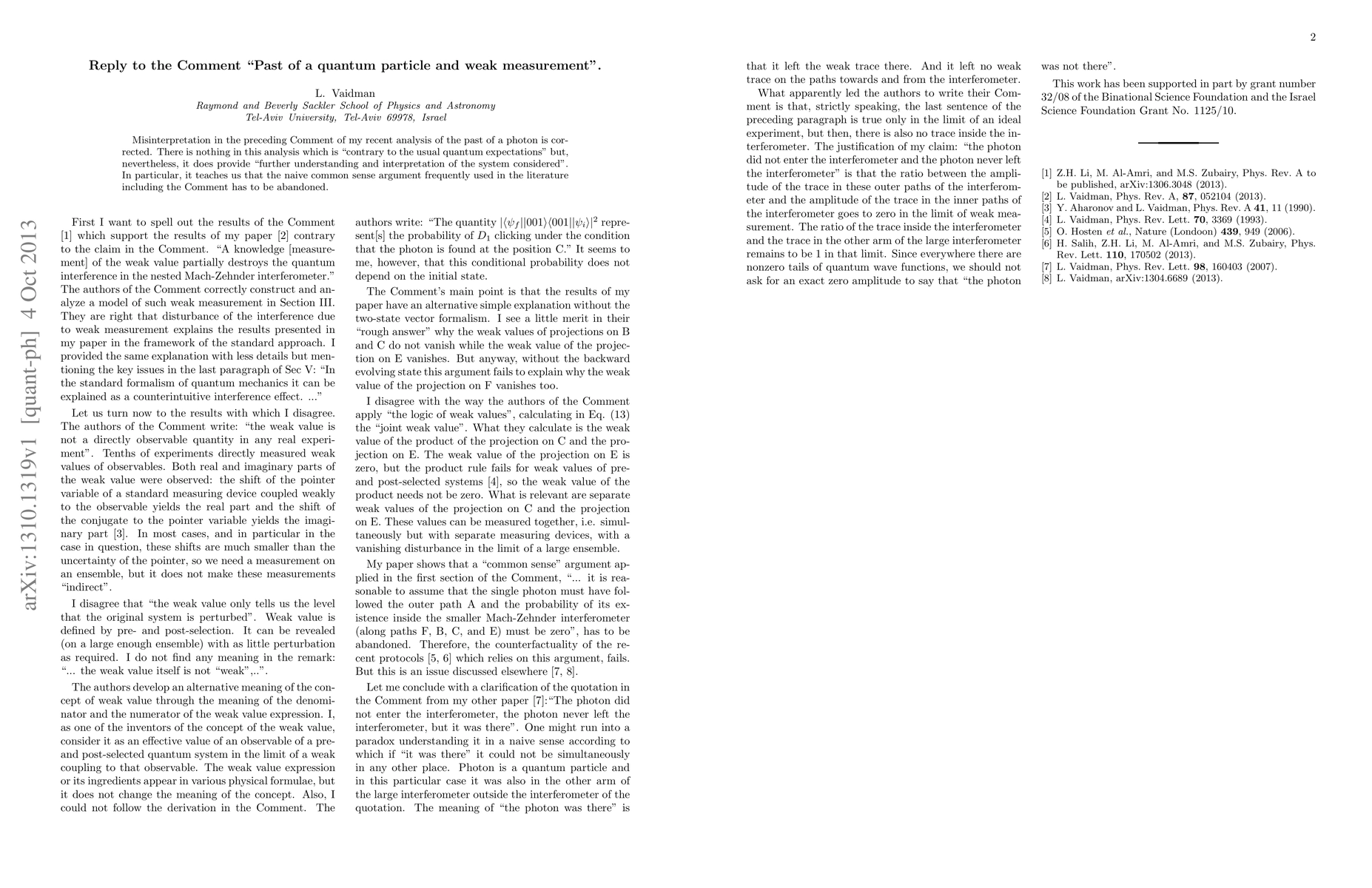 Misinterpretation in the preceding Comment of my recent analysis of the past of a photon is corrected. There is nothing in this analysis which is "contrary to the usual quantum expectations" but, nevertheless, it does provide "further understanding and interpretation of the system considered". In particular, it teaches us that the naive common sense argument frequently used in the literature including the Comment has to be abandoned.