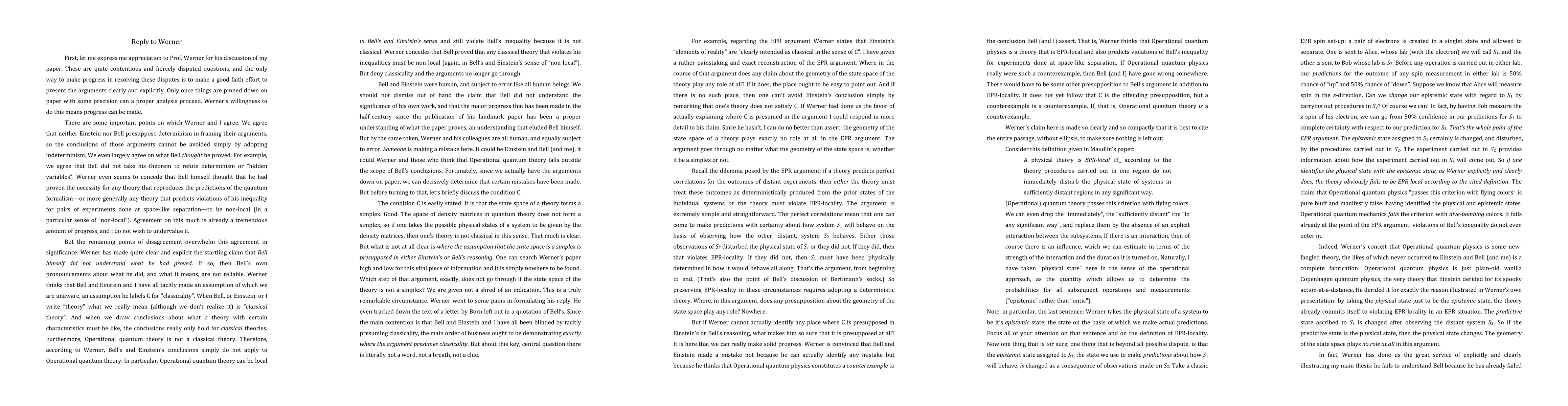 Reinhard Werner authored a comment on my paper "What Bell Did", disputing the conclusion and argumentation of the paper. This is my reply.