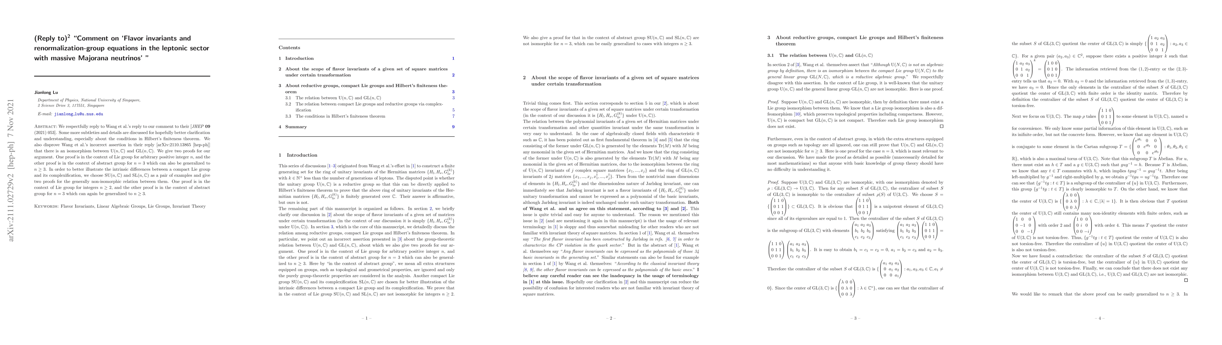 We respectfully reply to Wang et al.'s reply to our comment to their [JHEP $\textbf{09}$ (2021) 053]. Some more subtleties and details are discussed for hopefully better clarification and understanding, especially about the conditions in Hilbert's finiteness theorem. We also disprove Wang et al.'s incorrect assertion in their reply [arXiv:2110.13865 [hep-ph]] that there is an isomorphism between ${\rm U}(n,\mathbb{C})$ and ${\rm GL}(n,\mathbb{C})$. We give two proofs for our argument. One proof is in the context of Lie group for arbitrary positive integer $n$, and the other proof is in the context of abstract group for $n=3$ which can also be generalized to $n\geq 3$. In order to better illustrate the intrinsic differences between a compact Lie group and its complexification, we choose ${\rm SU}(n,\mathbb{C})$ and ${\rm SL}(n,\mathbb{C})$ as a pair of examples and give two proofs for the generally non-isomorphic relation between them. One proof is in the context of Lie group for integers $n\geq 2$, and the other proof is in the context of abstract group for $n=3$ which can again be generalized to $n\geq 3$.