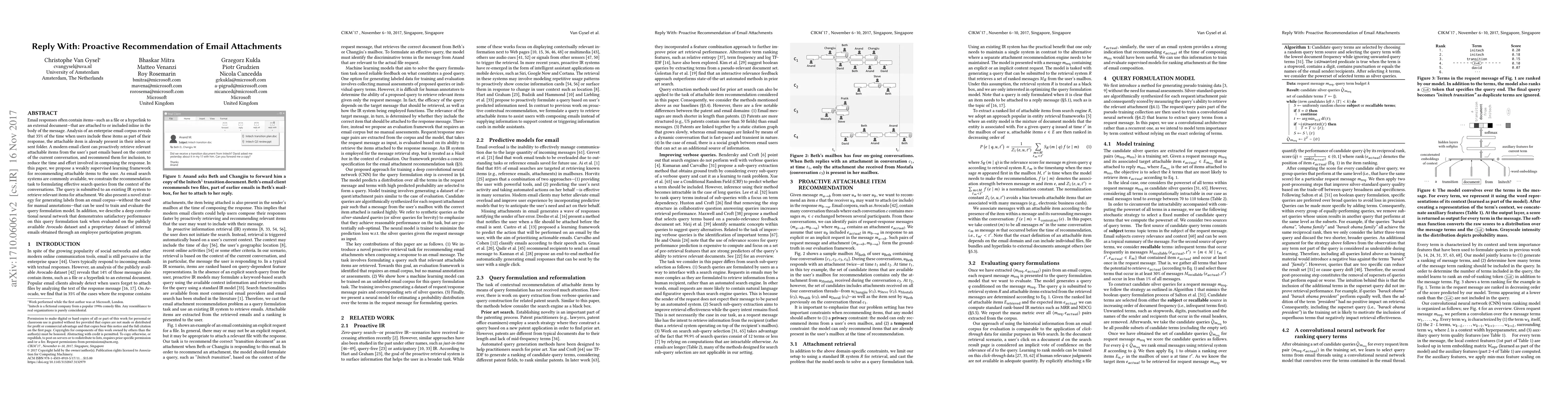 Email responses often contain items-such as a file or a hyperlink to an external document-that are attached to or included inline in the body of the message. Analysis of an enterprise email corpus reveals that 35% of the time when users include these items as part of their response, the attachable item is already present in their inbox or sent folder. A modern email client can proactively retrieve relevant attachable items from the user's past emails based on the context of the current conversation, and recommend them for inclusion, to reduce the time and effort involved in composing the response. In this paper, we propose a weakly supervised learning framework for recommending attachable items to the user. As email search systems are commonly available, we constrain the recommendation task to formulating effective search queries from the context of the conversations. The query is submitted to an existing IR system to retrieve relevant items for attachment. We also present a novel strategy for generating labels from an email corpus---without the need for manual annotations---that can be used to train and evaluate the query formulation model. In addition, we describe a deep convolutional neural network that demonstrates satisfactory performance on this query formulation task when evaluated on the publicly available Avocado dataset and a proprietary dataset of internal emails obtained through an employee participation program.