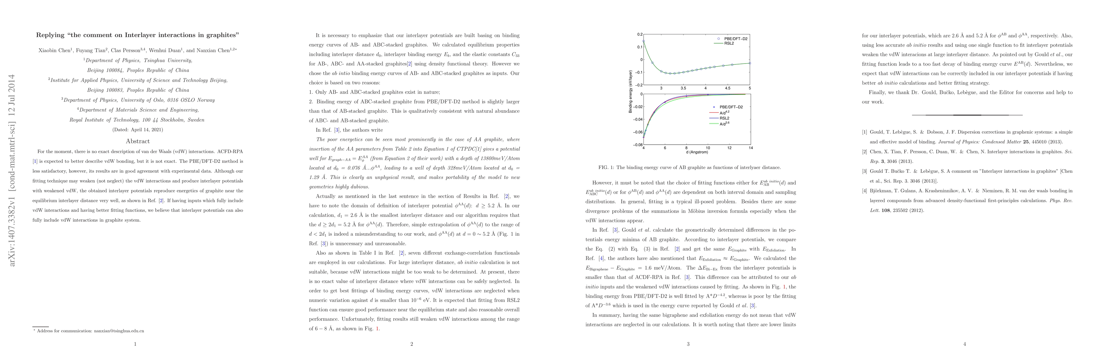 For the moment, there is no exact description of van der Waals (vdW) interactions. ACFD-RPA \cite{Gould1} is expected to better describe vdW bonding, but it is not exact. The PBE/DFT-D2 method is less satisfactory, however, its results are in good agreement with experimental data. Although our fitting technique may weaken (not neglect) the vdW interactions and produce interlayer potentials with weakened vdW, the obtained interlayer potentials reproduce energetics of graphite near the equilibrium interlayer distance very well, as shown in Ref. \cite{Chen}. If having inputs which fully include vdW interactions and having better fitting functions, we believe that interlayer potentials can also fully include vdW interactions in graphite system.