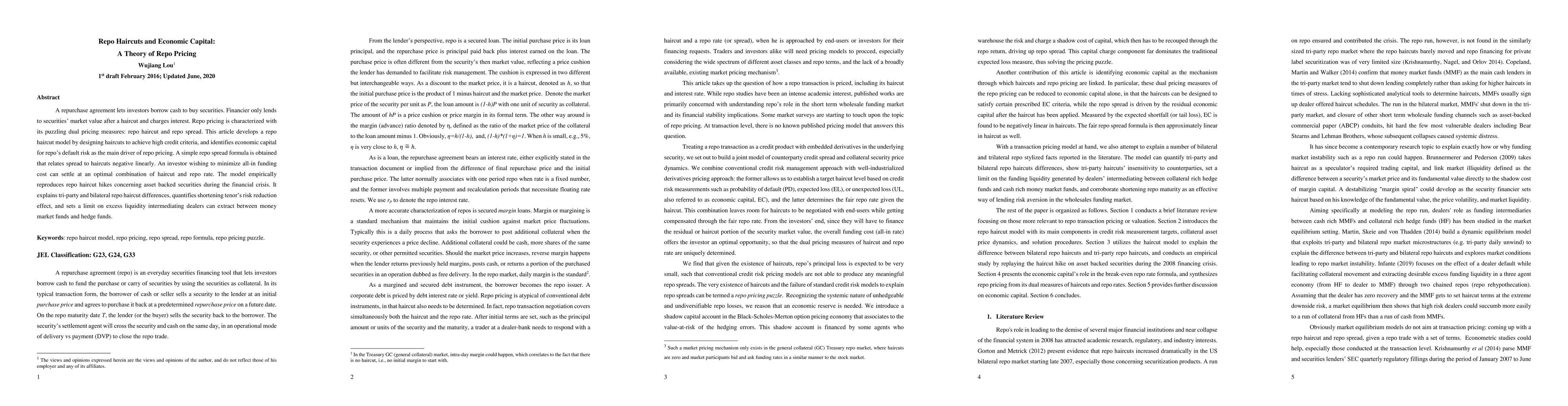 This paper develops a theoretical model explaining repo pricing through the interplay of haircuts and economic capital for default risk, showing how haircuts and repo spreads are negatively correlated. It identifies optimal combinations of haircut and repo rate to minimize funding costs and empirically validates the model during the financial crisis.