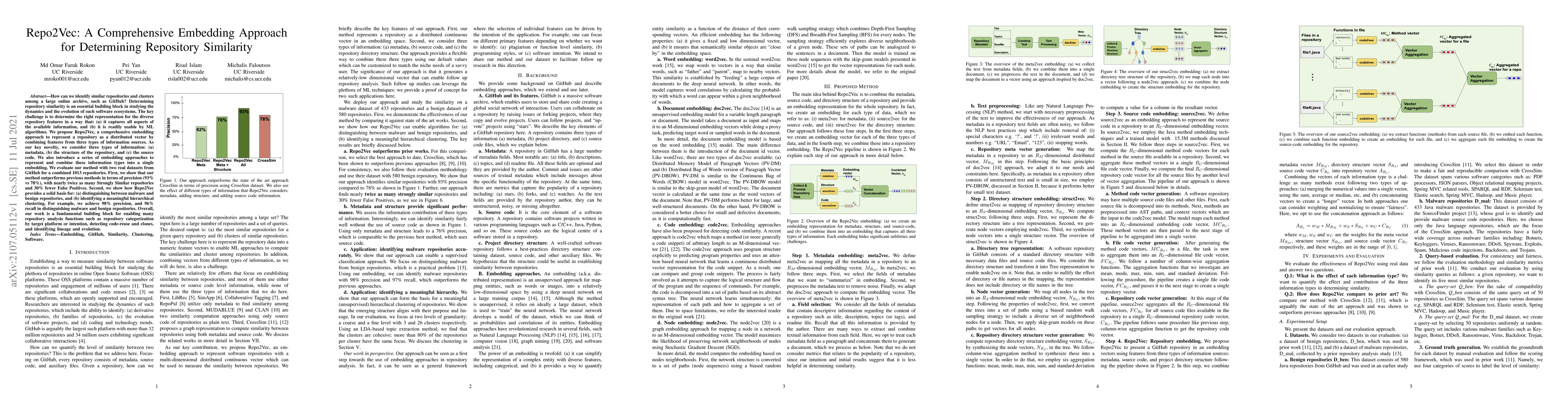 How can we identify similar repositories and clusters among a large online archive, such as GitHub? Determiningrepository similarity is an essential building block in studying the dynamics and the evolution of such software ecosystems. The key challenge is to determine the right representation for the diverse repository features in a way that: (a) it captures all aspects of the available information, and (b) it is readily usable by MLalgorithms. We propose Repo2Vec, a comprehensive embedding approach to represent a repository as a distributed vector by combining features from three types of information sources. As our key novelty, we consider three types of information: (a)metadata, (b) the structure of the repository, and (c) the source code. We also introduce a series of embedding approaches to represent and combine these information types into a single embedding. We evaluate our method with two real datasets from GitHub for a combined 1013 repositories. First, we show that our method outperforms previous methods in terms of precision (93%vs 78%), with nearly twice as many Strongly Similar repositories and 30% fewer False Positives. Second, we show how Repo2Vecprovides a solid basis for: (a) distinguishing between malware and benign repositories, and (b) identifying a meaningful hierarchical clustering. For example, we achieve 98% precision and 96%recall in distinguishing malware and benign repositories. Overall, our work is a fundamental building block for enabling many repository analysis functions such as repository categorization by target platform or intention, detecting code-reuse and clones, and identifying lineage and evolution.