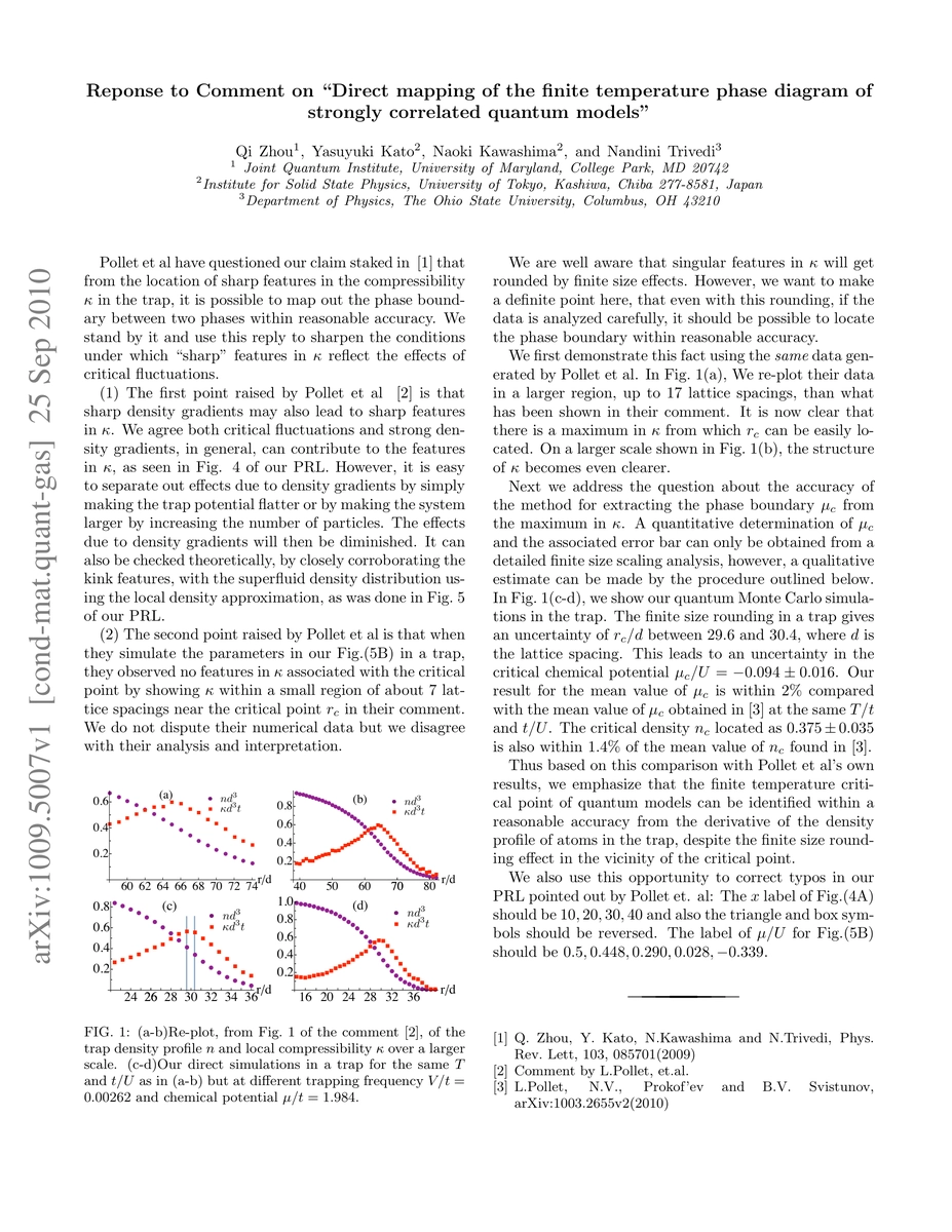 Pollet et al have questioned our claim staked in Phys. Rev. Lett. 103, 085701 (2009) that from the location of sharp features in the compressibility in the trap, it is possible to map out the phase boundary between two phases within reasonable accuracy. We stand by it and use this reply to sharpen the conditions under which "sharp" features in compressibility reflect the effects of critical fluctuations.