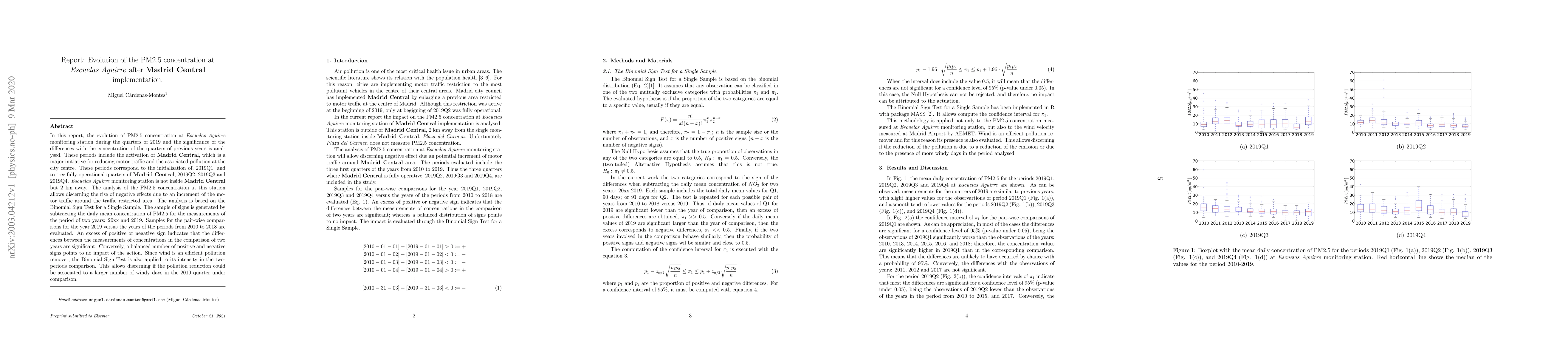 This report analyzes the evolution of PM2.5 concentration at Escuelas Aguirre monitoring station from 2019Q1 to 2019Q4, focusing on the impact of Madrid Central's implementation to reduce motor traffic. The study uses the Binomial Sign Test to determine significant differences in PM2.5 levels compared to previous years and assesses whether increased wind intensity correlates with the pollution reduction.