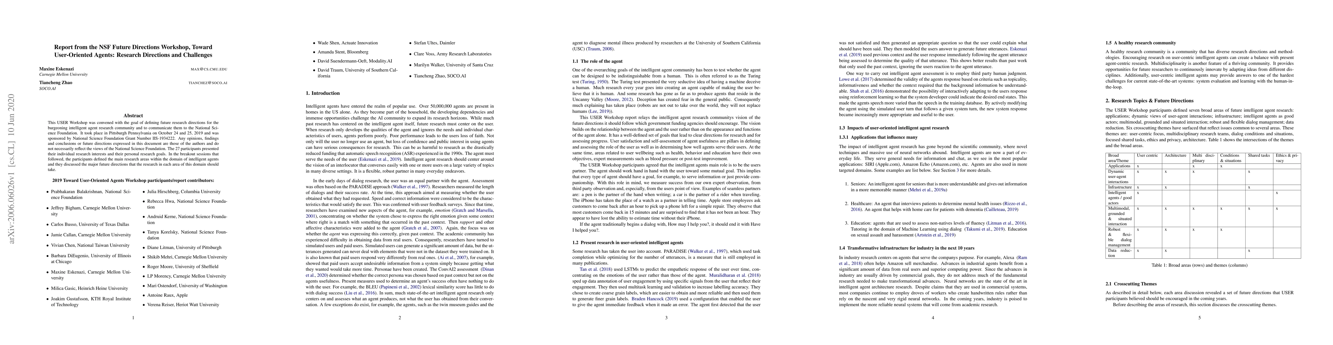 This USER Workshop was convened with the goal of defining future research directions for the burgeoning intelligent agent research community and to communicate them to the National Science Foundation. It took place in Pittsburgh Pennsylvania on October 24 and 25, 2019 and was sponsored by National Science Foundation Grant Number IIS-1934222. Any opinions, findings and conclusions or future directions expressed in this document are those of the authors and do not necessarily reflect the views of the National Science Foundation. The 27 participants presented their individual research interests and their personal research goals. In the breakout sessions that followed, the participants defined the main research areas within the domain of intelligent agents and they discussed the major future directions that the research in each area of this domain should take