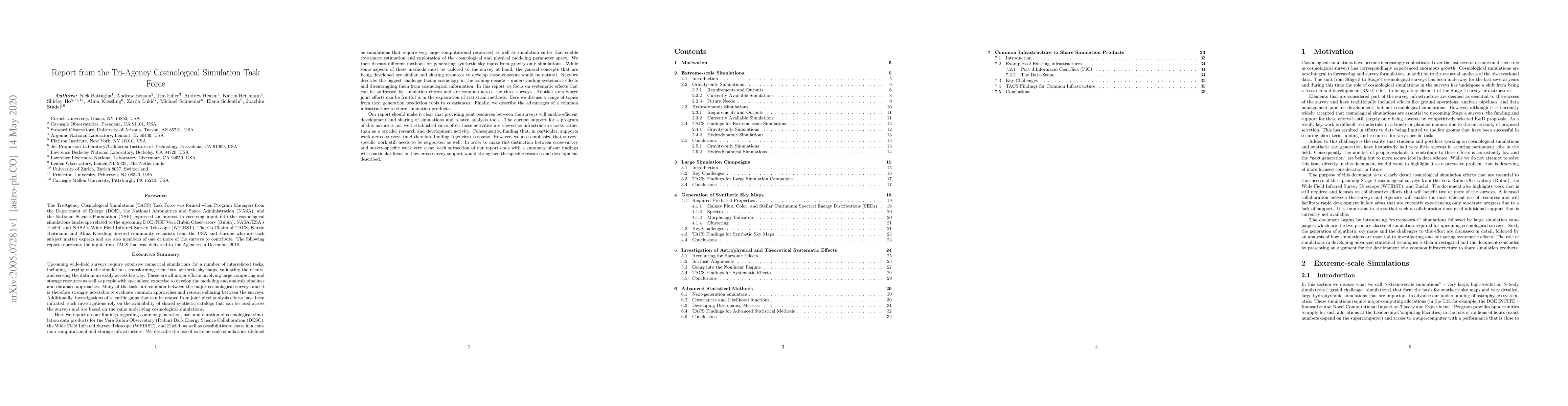The Tri-Agency Cosmological Simulations (TACS) Task Force was formed when Program Managers from the Department of Energy (DOE), the National Aeronautics and Space Administration (NASA), and the National Science Foundation (NSF) expressed an interest in receiving input into the cosmological simulations landscape related to the upcoming DOE/NSF Vera Rubin Observatory (Rubin), NASA/ESA's Euclid, and NASA's Wide Field Infrared Survey Telescope (WFIRST). The Co-Chairs of TACS, Katrin Heitmann and Alina Kiessling, invited community scientists from the USA and Europe who are each subject matter experts and are also members of one or more of the surveys to contribute. The following report represents the input from TACS that was delivered to the Agencies in December 2018.