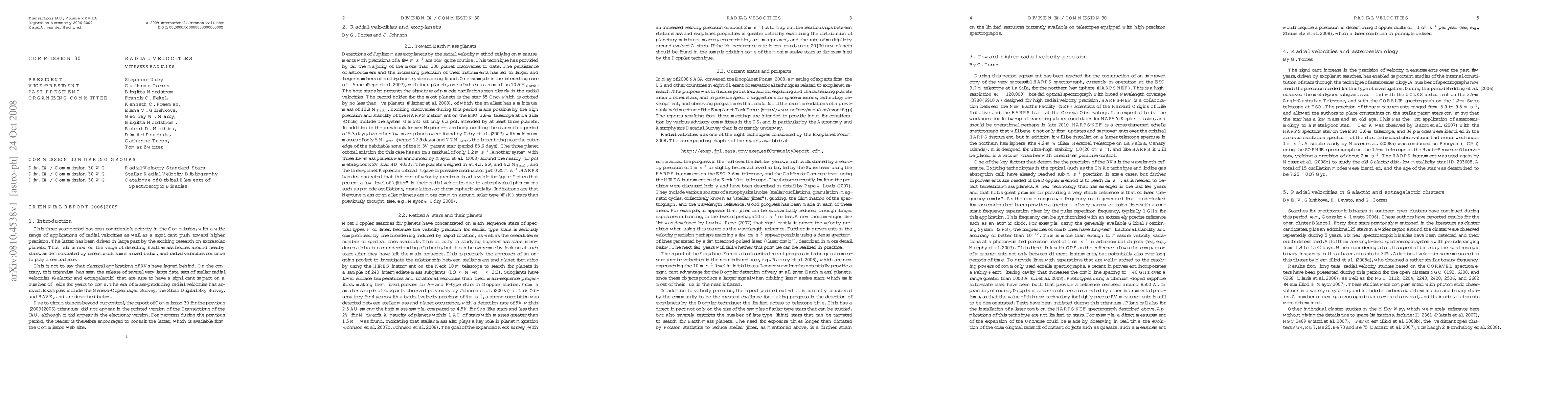 This report from IAU Commission 30 on Radial Velocities (2006-2009) provides updates on the study of radial velocities in relation to exoplanets, asteroseismology, and galactic structures, highlighting advancements in precision and large survey projects like the Geneva-Copenhagen Survey and RAVE. It also details the activities of working groups focused on radial velocity standards, bibliography, and spectroscopic binaries.