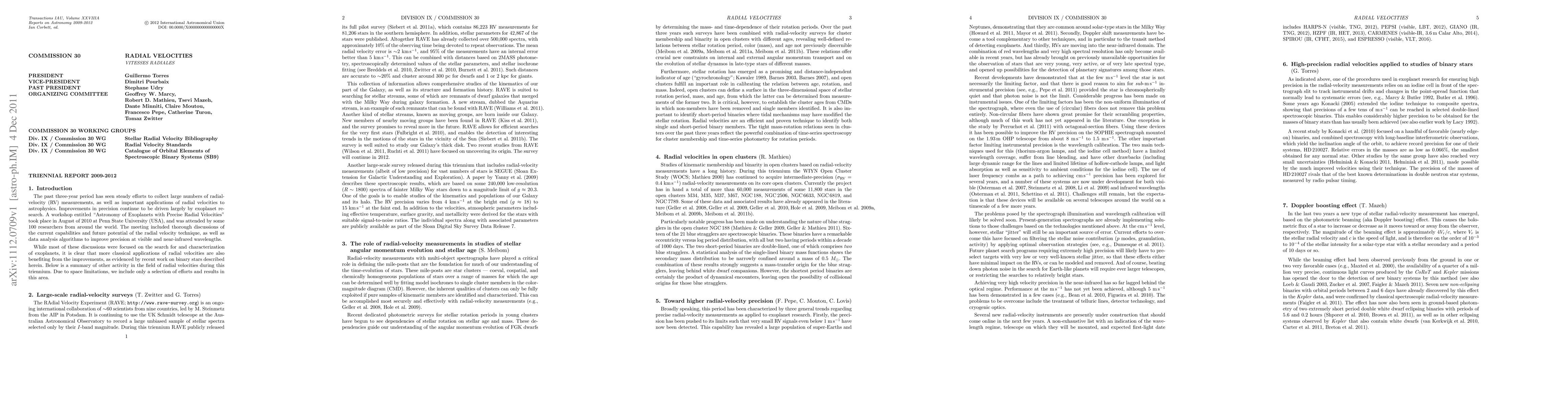 The IAU Commission 30 report (2009-2012) summarizes advancements in large-scale radial-velocity surveys and their applications in studying stellar angular momentum evolution and age. It also highlights efforts toward achieving higher radial-velocity precision and its role in binary star research.