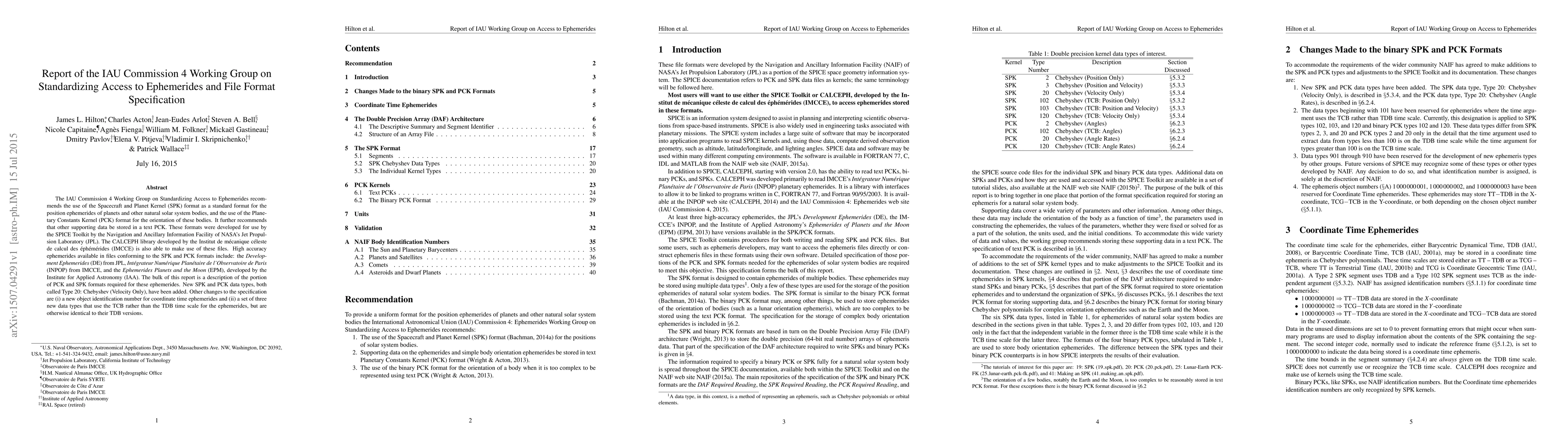The IAU Commission 4 Working Group on Standardizing Access to Ephemerides recommends the use of the Spacecraft and Planet Kernel (SPK) format as a standard format for the position ephemerides of planets and other natural solar system bodies, and the use of the Planetary Constants Kernel (PCK) format for the orientation of these bodies. It further recommends that other supporting data be stored in a text PCK. These formats were developed for use by the SPICE Toolkit by the Navigation and Ancillary Information Facility of NASA's Jet Propulsion Laboratory (JPL). The CALCEPH library developed by the Institut de mecanique celeste de calcul des ephemerides (IMCCE) is also able to make use of these files. High accuracy ephemerides available in files conforming to the SPK and PCK formats include: the Development Ephemerides (DE) from JPL, Integrateur Numerique Planetaire de l'Observatoire de Paris (INPOP) from IMCCE, and the Ephemerides Planets and the Moon (EPM), developed by the Institute for Applied Astronomy (IAA). The bulk of this report is a description of the portion of PCK and SPK formats required for these ephemerides. New SPK and PCK data types, both called Type 20: Chebyshev (Velocity Only), have been added. Other changes to the specification are (i) a new object identification number for coordinate time ephemerides and (ii) a set of three new data types that use the TCB rather than the TDB time scale for the ephemerides, but are otherwise identical to their TDB versions.