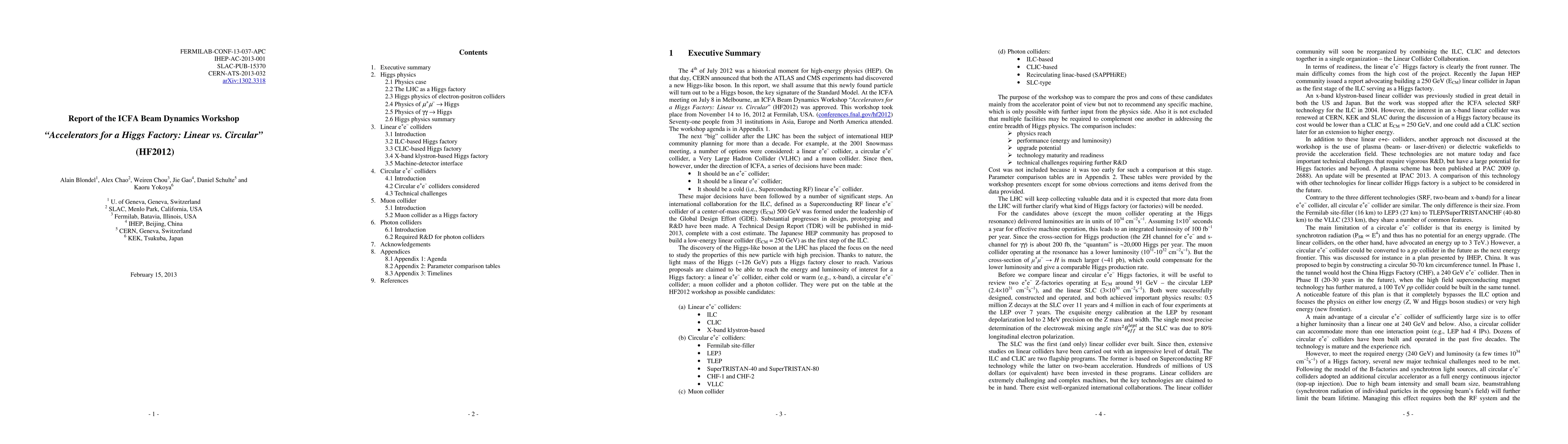 This report summarizes the ICFA Beam Dynamics Workshop on potential accelerators for a Higgs Factory, comparing linear and circular e+e- colliders, muon colliders, and photon colliders based on physics reach, performance, upgrade potential, technology maturity, and technical challenges.