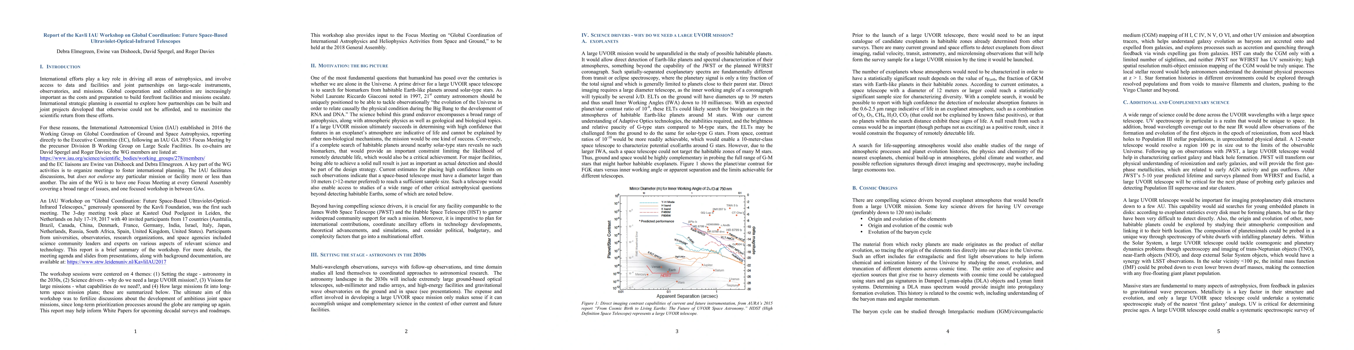 International efforts play a key role in driving all areas of astrophysics. Strategic planning is essential to explore possible partnerships and joint projects that otherwise could not be afforded, and to maximize their scientific return. For these reasons, the International Astronomical Union (IAU) established in 2016 the Working Group on Global Coordination of Ground and Space Astrophysics. The Working Group held a Kavli IAU Workshop on "Global Coordination: Future Space-Based Ultraviolet-Optical-Infrared Telescopes" in July 2017, bringing together scientific leaders from 17 countries to discuss compelling science drivers, technical requirements, political constraints, and opportunities for a future large-scale UV/optical/Infrared space mission. This report summarizes the workshop and recommends that astronomers worldwide intensify their activities to explore the possibilities for science with such a mission, including consideration of instrumentation and technology definition and development, construction, launch, data analysis, and complementary science. The workshop presentations are available at https://www.strw.leidenuniv.nl/KavliIAU2017.