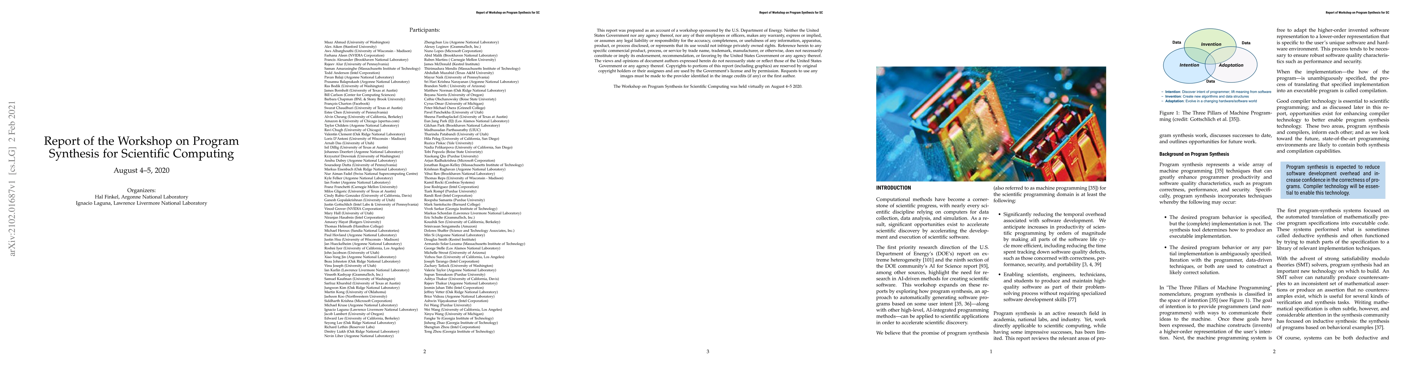 This report summarizes the outcomes of a 2020 workshop on program synthesis for scientific computing, reviewing current successes and identifying future opportunities in this field. It highlights the limited but promising applications of program synthesis in scientific computing and proposes directions for future research.