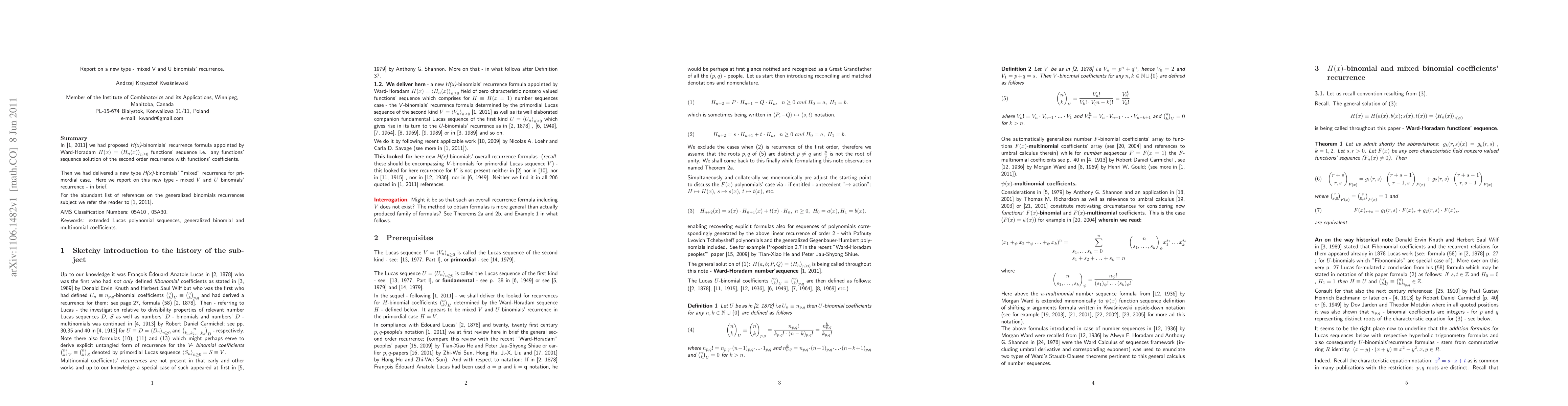 Summary: This paper introduces a novel generalized recurrence relation for mixed V and U binomials, specifically tailored for primordial sequence cases, marking a significant advancement in binomial recurrence theory. The report provides a concise overview of the newly derived recurrence.