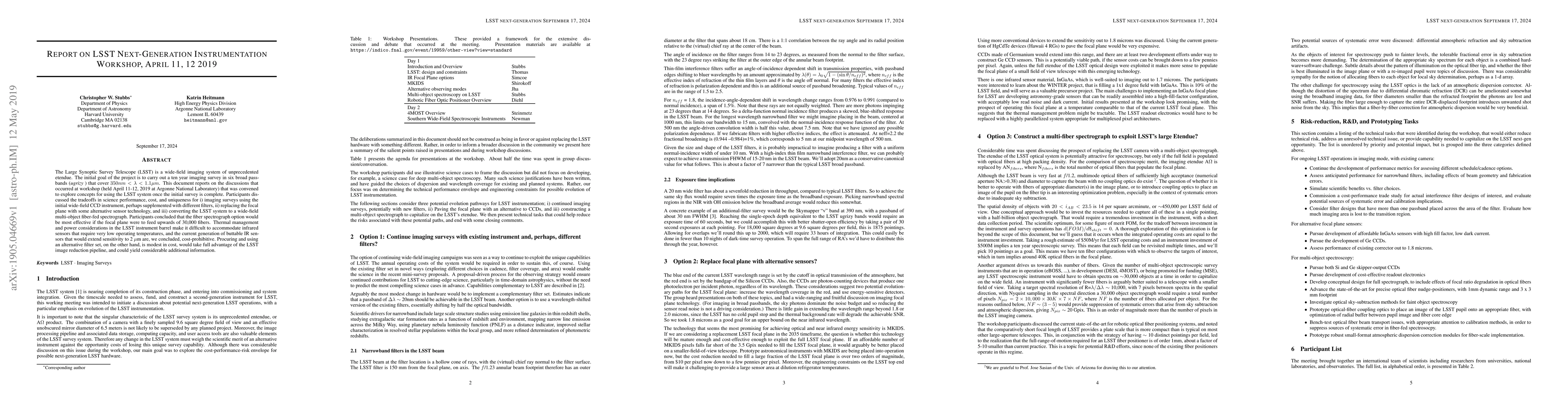 The LSST Next-generation Instrumentation Workshop explored concepts for post-survey use of the LSST system, including imaging surveys, alternative sensor technologies, and a fiber-fed spectrograph. The fiber spectrograph option was deemed most effective, while infrared sensor use was deemed impractical due to thermal and cost constraints.