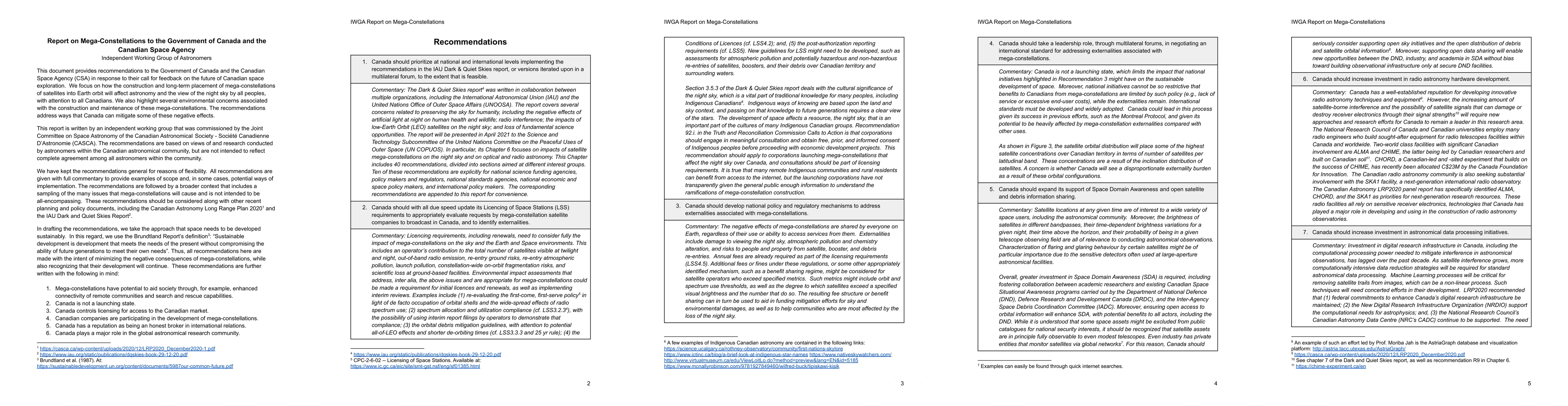 This document provides recommendations to the Government of Canada and the Canadian Space Agency in response to their call for feedback on the future of Canadian space exploration. The report focuses on how the construction and long-term placement of mega-constellations of satellites into Earth orbit will affect astronomy and the view of the night sky by all peoples, with attention to all Canadians. The broader discussion highlights several environmental concerns associated with the construction and maintenance of these mega-constellations. The eight recommendations here address ways that Canada can play a role in mitigating some of these negative effects through national and international initiatives. In drafting the recommendations, we take the approach that space needs to be developed sustainably. In this regard, we use the Brundtland Report's definition: "Sustainable development is the development that meets the needs of the present without compromising the ability of future generations to meet their own needs." Thus, all recommendations here are made with the intent of minimizing the negative consequences of mega-constellations, while also recognizing that their development will continue.