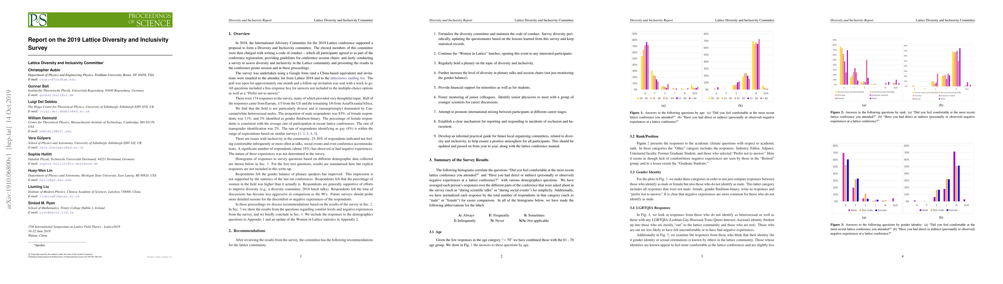 Summary: This report presents findings from a 2019 survey conducted by the newly formed Committee on Diversity and Inclusivity to evaluate the levels of diversity and inclusivity within the Lattice community. The results aim to inform future initiatives to enhance community inclusivity.