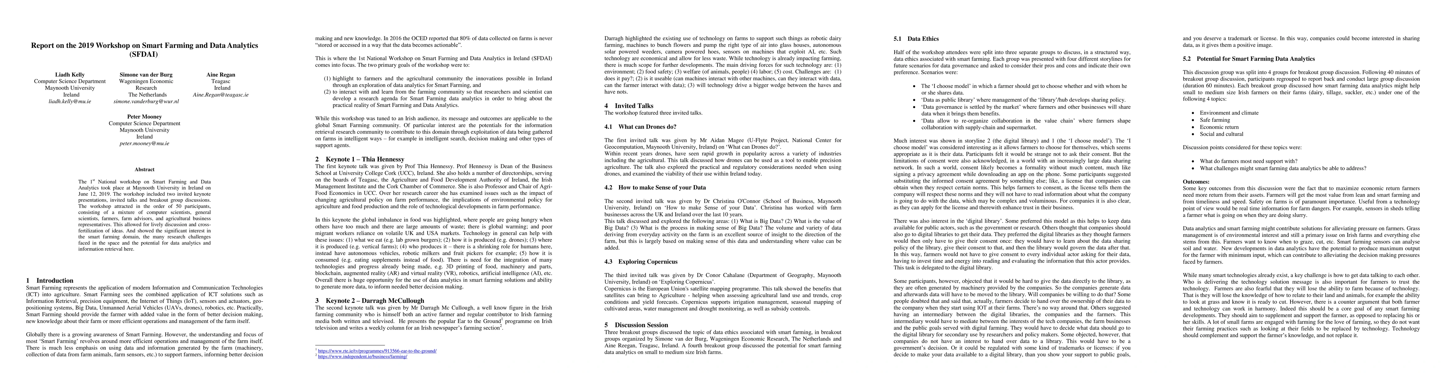 The 1st National workshop on Smart Farming and Data Analytics took place at Maynooth University in Ireland on June 12, 2019. The workshop included two invited keynote presentations, invited talks and breakout group discussions. The workshop attracted in the order of 50 participants, consisting of a mixture of computer scientists, general scientists, farmers, farm advisors, and agricultural business representatives. This allowed for lively discussion and cross-fertilization of ideas. And showed the significant interest in the smart farming domain, the many research challenges faced in the space and the potential for data analytics and information retrieval here.
