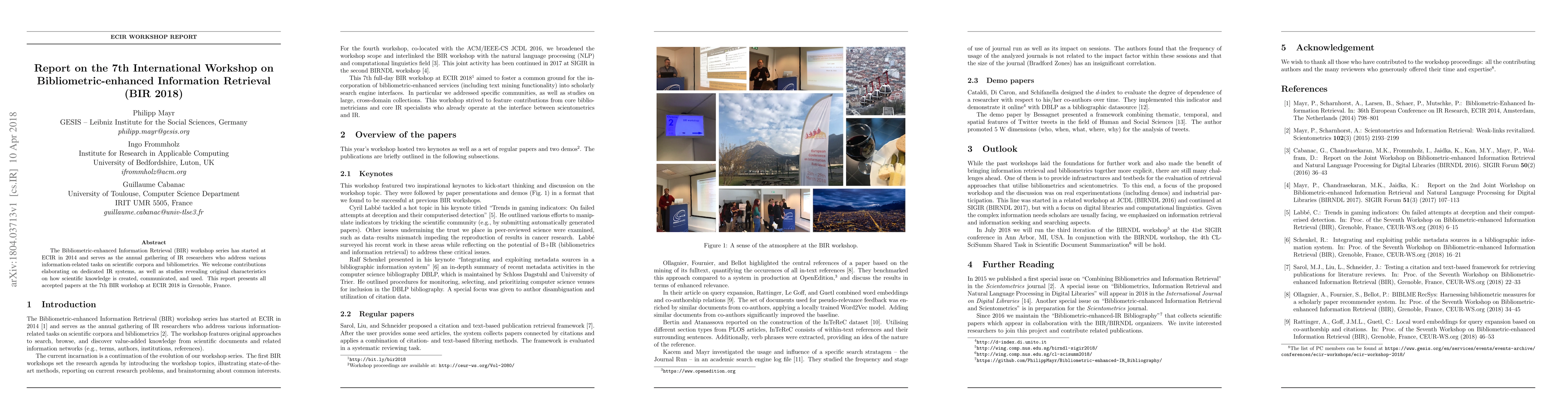 The Bibliometric-enhanced Information Retrieval (BIR) workshop series has started at ECIR in 2014 and serves as the annual gathering of IR researchers who address various information-related tasks on scientific corpora and bibliometrics. We welcome contributions elaborating on dedicated IR systems, as well as studies revealing original characteristics on how scientific knowledge is created, communicated, and used. This report presents all accepted papers at the 7th BIR workshop at ECIR 2018 in Grenoble, France.