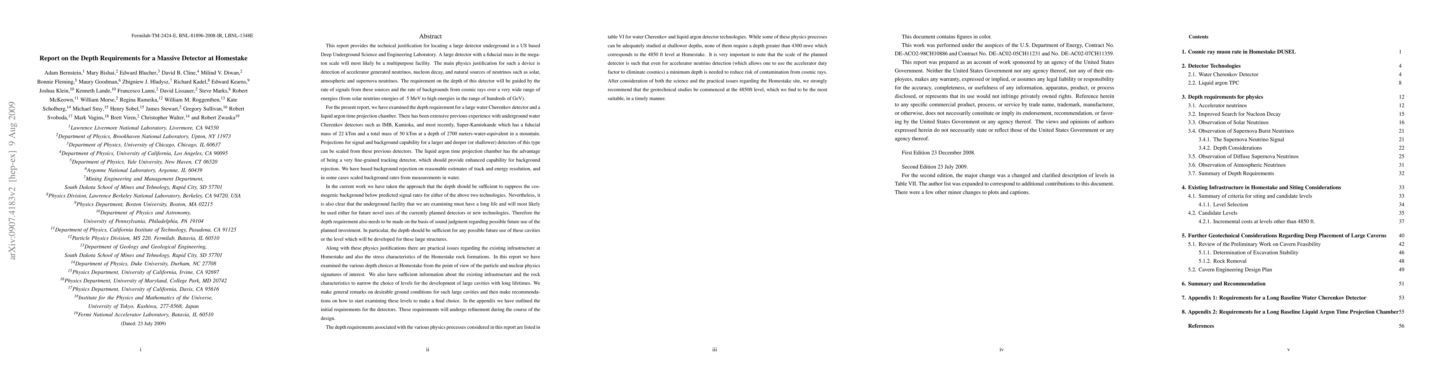 This report justifies the placement of a large, multipurpose detector underground at the Homestake Deep Underground Science and Engineering Laboratory for detecting various neutrino sources and nucleon decay, recommending a minimum depth of 4850 ft to mitigate cosmic ray contamination. Practical site considerations and geotechnical studies at this depth are strongly advised.