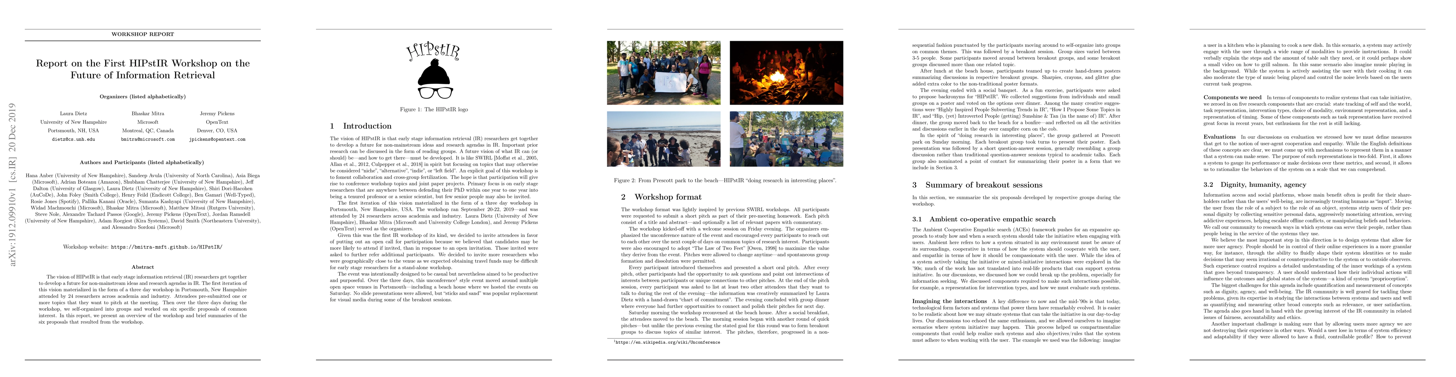 The vision of HIPstIR is that early stage information retrieval (IR) researchers get together to develop a future for non-mainstream ideas and research agendas in IR. The first iteration of this vision materialized in the form of a three day workshop in Portsmouth, New Hampshire attended by 24 researchers across academia and industry. Attendees pre-submitted one or more topics that they want to pitch at the meeting. Then over the three days during the workshop, we self-organized into groups and worked on six specific proposals of common interest. In this report, we present an overview of the workshop and brief summaries of the six proposals that resulted from the workshop.