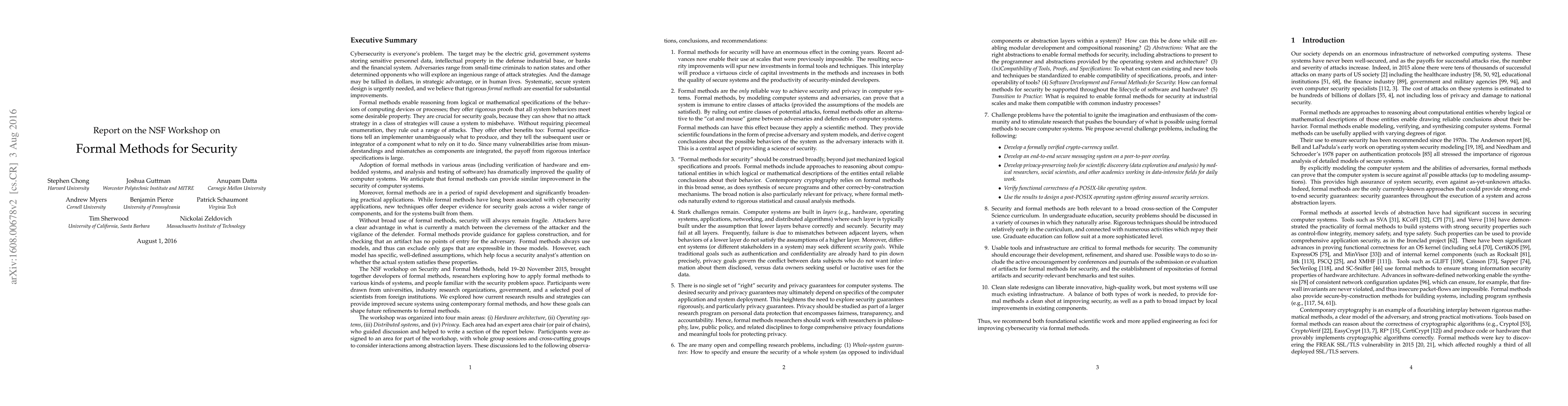 Summary: This report details the outcomes of the NSF Workshop on Formal Methods for Security, held on November 19-20, 2015, focusing on advancing security through formal methods. It highlights key discussions, research directions, and collaborative efforts among experts in the field.