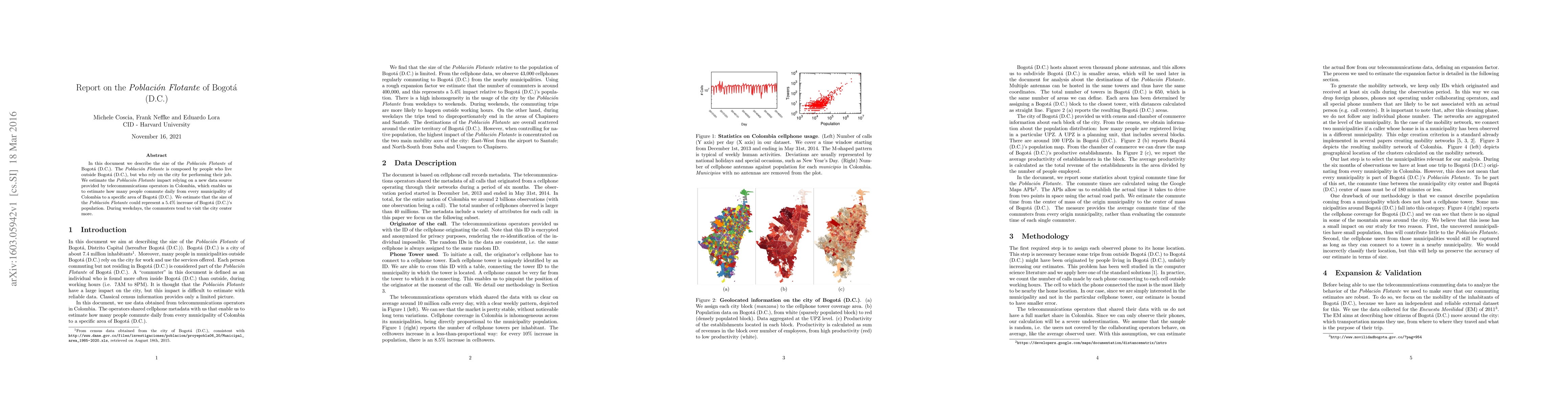 This report estimates Bogota (D.C.)'s floating population, or commuters from outside the city, at 5.4% of the total population using telecom data. Commuter patterns show increased city center visits during weekdays.