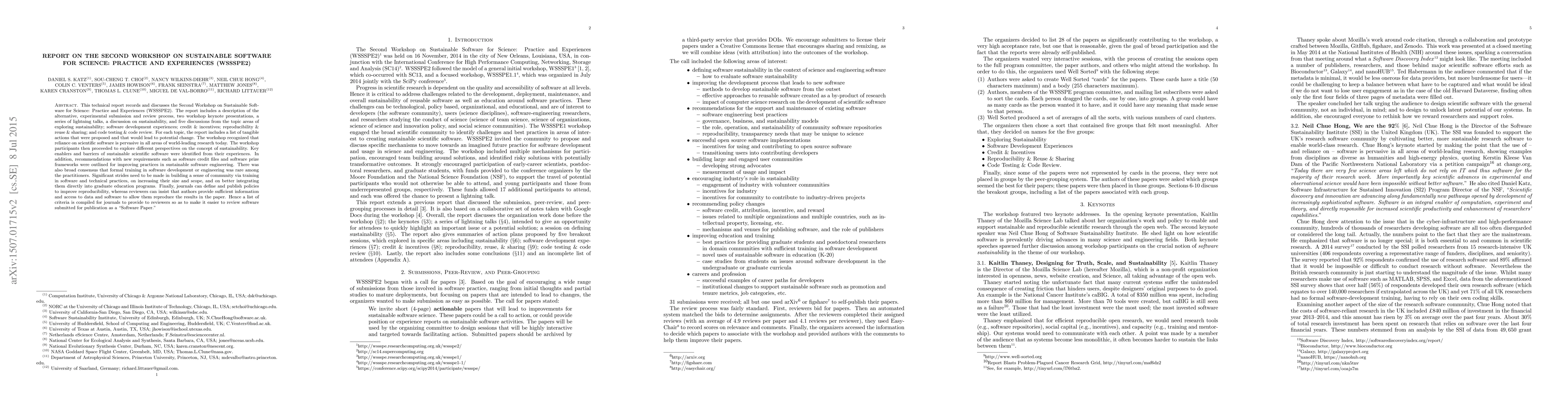 This report summarizes the Second Workshop on Sustainable Software for Science, detailing alternative submission and review processes, keynotes, and discussions on sustainability in scientific software. It highlights actionable recommendations for improving sustainable software practices, emphasizing the need for formal training and community building, and suggests criteria for journals to enhance reproducibility in software papers.