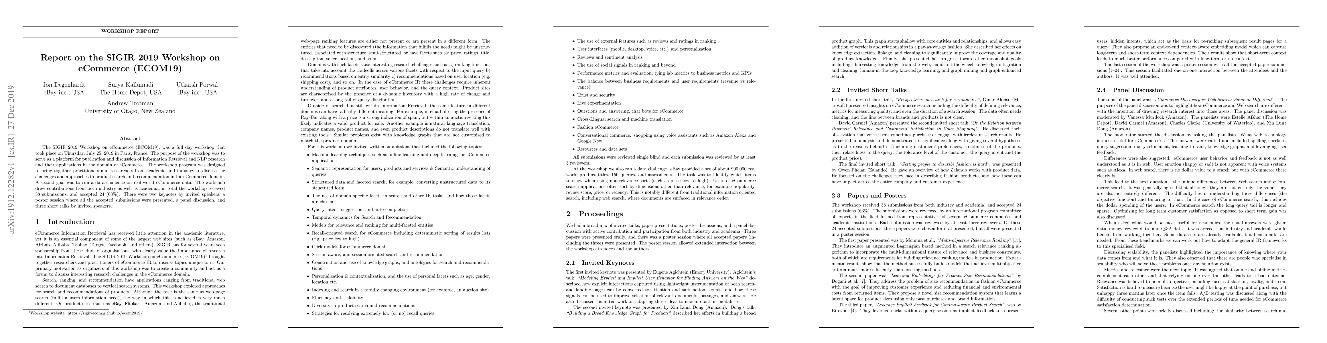 The SIGIR 2019 Workshop on eCommerce (ECOM19) focused on discussing Information Retrieval and NLP applications in eCommerce, featuring a data challenge, keynotes, and presentations from 24 accepted submissions out of 38. The event aimed to foster collaboration between academia and industry on product search and recommendation challenges.