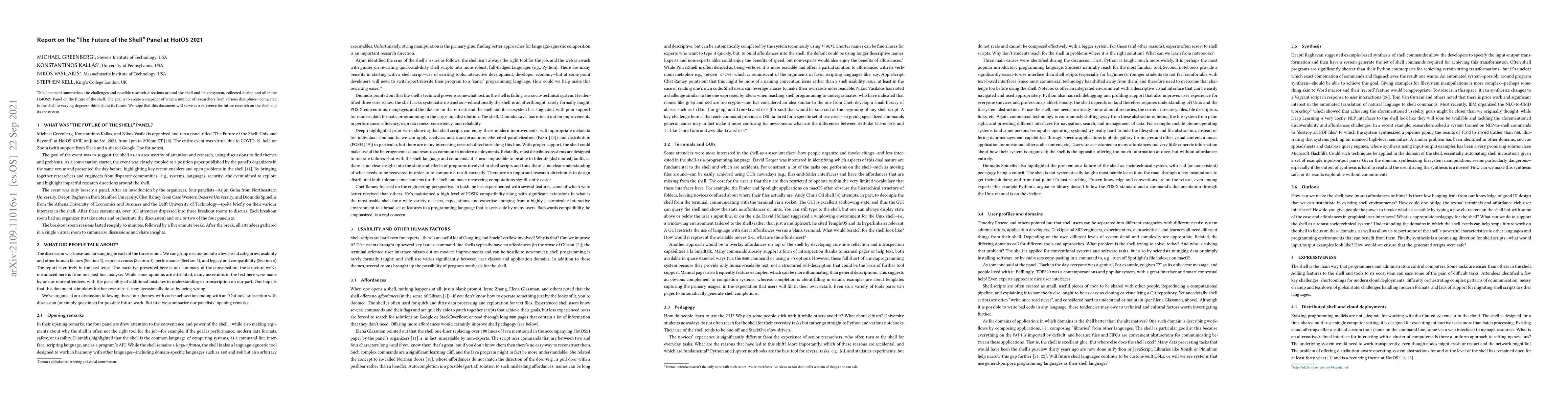 This report summarizes discussions from the HotOS 2021 panel on the future of the shell, highlighting challenges and potential research directions within its ecosystem. It aims to provide a reference for future research by capturing insights from researchers across various disciplines.