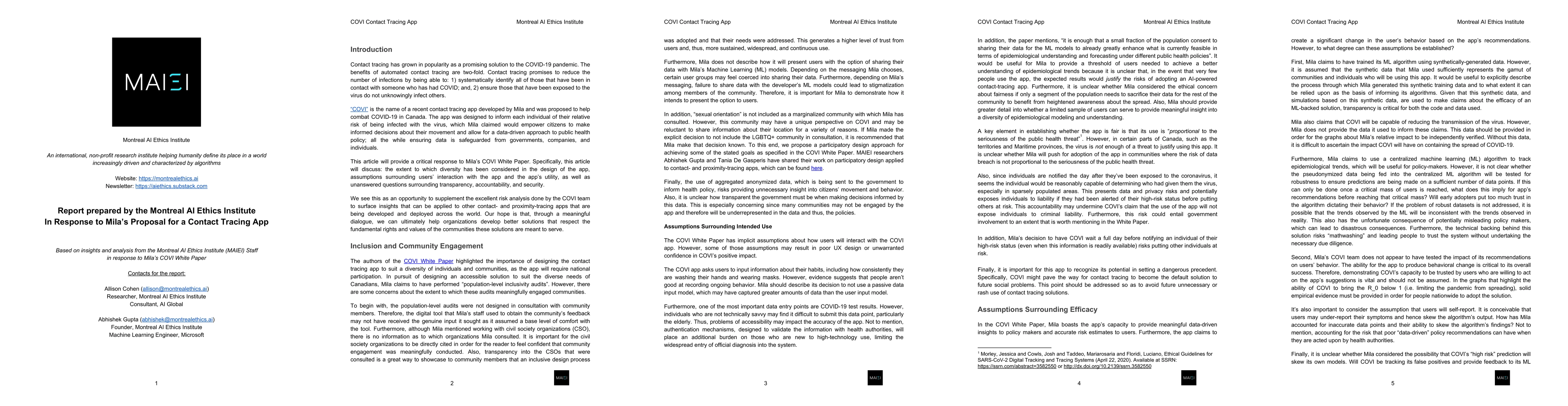 Contact tracing has grown in popularity as a promising solution to the COVID-19 pandemic. The benefits of automated contact tracing are two-fold. Contact tracing promises to reduce the number of infections by being able to: 1) systematically identify all of those that have been in contact with someone who has had COVID; and, 2) ensure those that have been exposed to the virus do not unknowingly infect others. "COVI" is the name of a recent contact tracing app developed by Mila and was proposed to help combat COVID-19 in Canada. The app was designed to inform each individual of their relative risk of being infected with the virus, which Mila claimed would empower citizens to make informed decisions about their movement and allow for a data-driven approach to public health policy; all the while ensuring data is safeguarded from governments, companies, and individuals. This article will provide a critical response to Mila's COVI White Paper. Specifically, this article will discuss: the extent to which diversity has been considered in the design of the app, assumptions surrounding users' interaction with the app and the app's utility, as well as unanswered questions surrounding transparency, accountability, and security. We see this as an opportunity to supplement the excellent risk analysis done by the COVI team to surface insights that can be applied to other contact- and proximity-tracing apps that are being developed and deployed across the world. Our hope is that, through a meaningful dialogue, we can ultimately help organizations develop better solutions that respect the fundamental rights and values of the communities these solutions are meant to serve.