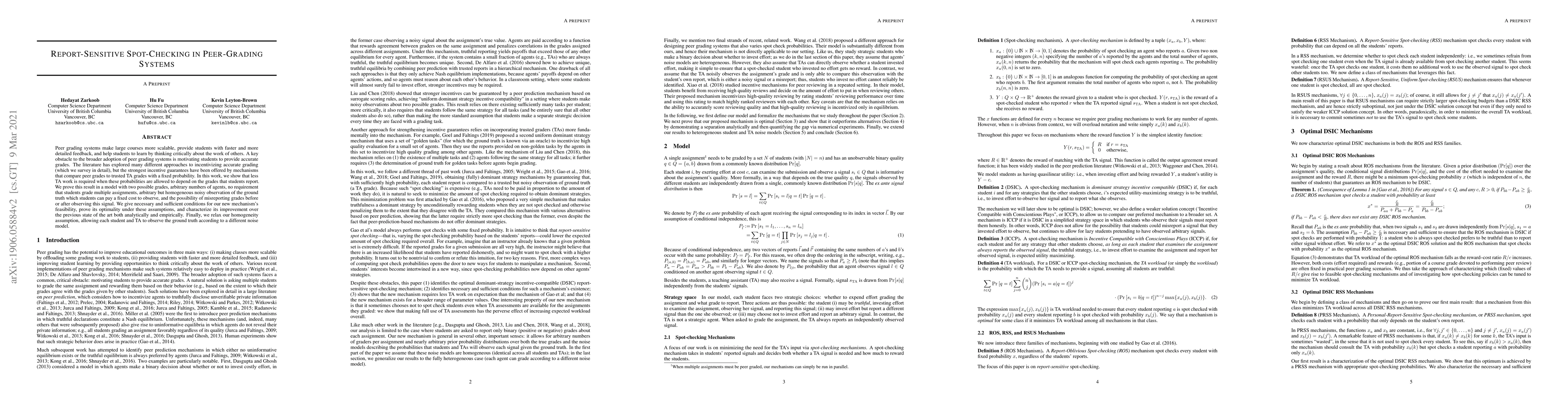 This paper proposes a novel mechanism for incentivizing accurate peer grading in large courses, showing that it requires less oversight by teaching assistants (TAs) compared to existing methods. The new approach allows the probability of spot-checking grades to vary based on the reported grades, optimizing TA workload while maintaining accuracy.