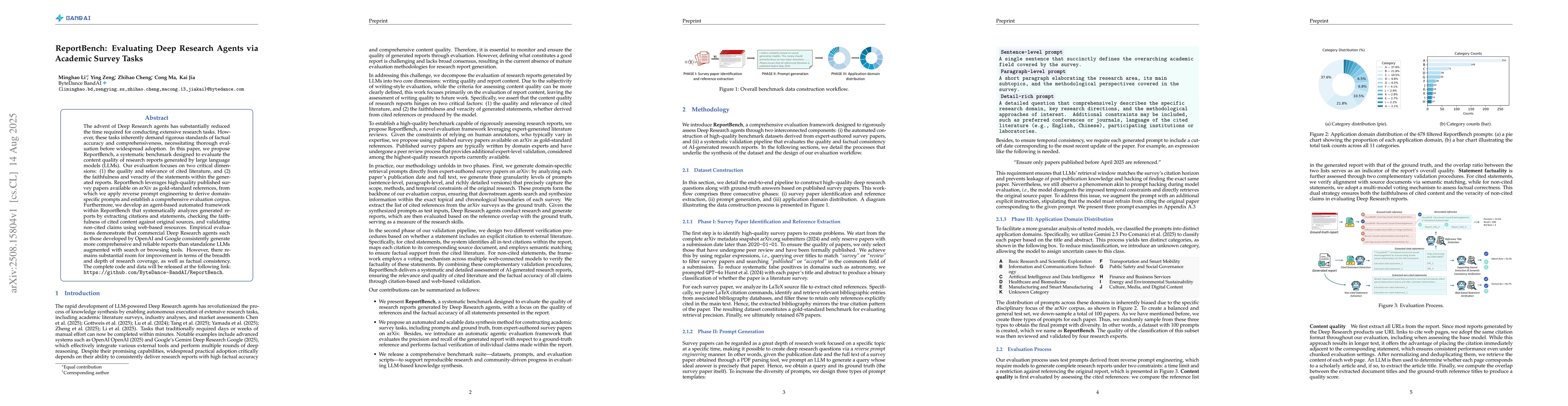 The advent of Deep Research agents has substantially reduced the time required for conducting extensive research tasks. However, these tasks inherently demand rigorous standards of factual accuracy and comprehensiveness, necessitating thorough evaluation before widespread adoption. In this paper, we propose ReportBench, a systematic benchmark designed to evaluate the content quality of research reports generated by large language models (LLMs). Our evaluation focuses on two critical dimensions: (1) the quality and relevance of cited literature, and (2) the faithfulness and veracity of the statements within the generated reports. ReportBench leverages high-quality published survey papers available on arXiv as gold-standard references, from which we apply reverse prompt engineering to derive domain-specific prompts and establish a comprehensive evaluation corpus. Furthermore, we develop an agent-based automated framework within ReportBench that systematically analyzes generated reports by extracting citations and statements, checking the faithfulness of cited content against original sources, and validating non-cited claims using web-based resources. Empirical evaluations demonstrate that commercial Deep Research agents such as those developed by OpenAI and Google consistently generate more comprehensive and reliable reports than standalone LLMs augmented with search or browsing tools. However, there remains substantial room for improvement in terms of the breadth and depth of research coverage, as well as factual consistency. The complete code and data will be released at the following link: https://github.com/ByteDance-BandAI/ReportBench