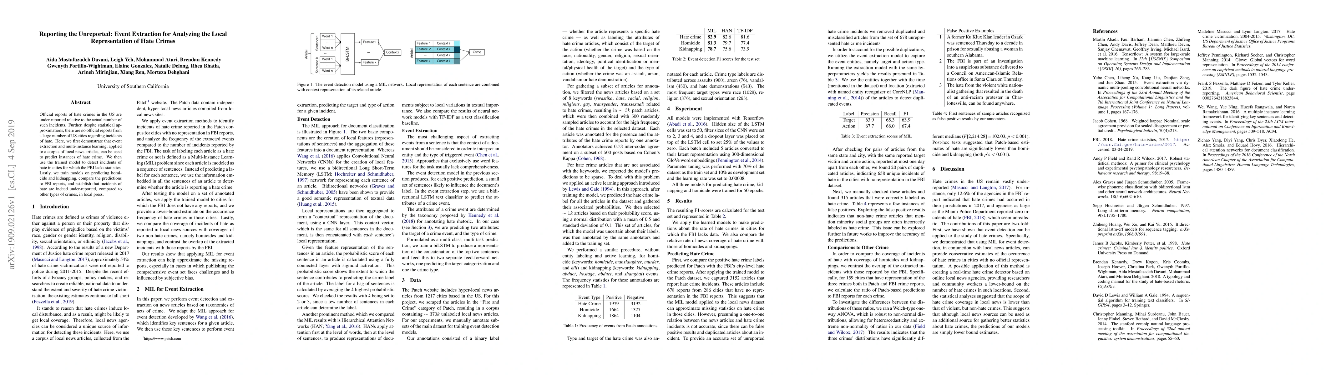 Official reports of hate crimes in the US are under-reported relative to the actual number of such incidents. Further, despite statistical approximations, there are no official reports from a large number of US cities regarding incidents of hate. Here, we first demonstrate that event extraction and multi-instance learning, applied to a corpus of local news articles, can be used to predict instances of hate crime. We then use the trained model to detect incidents of hate in cities for which the FBI lacks statistics. Lastly, we train models on predicting homicide and kidnapping, compare the predictions to FBI reports, and establish that incidents of hate are indeed under-reported, compared to other types of crimes, in local press.