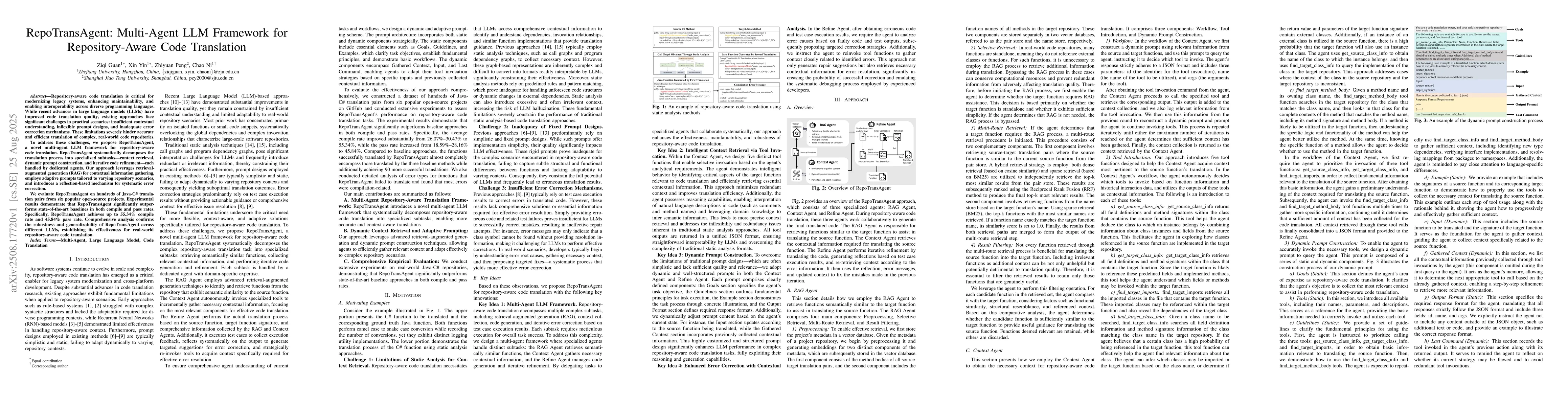 Repository-aware code translation is critical for modernizing legacy systems, enhancing maintainability, and enabling interoperability across diverse programming languages. While recent advances in large language models (LLMs) have improved code translation quality, existing approaches face significant challenges in practical scenarios: insufficient contextual understanding, inflexible prompt designs, and inadequate error correction mechanisms. These limitations severely hinder accurate and efficient translation of complex, real-world code repositories. To address these challenges, we propose RepoTransAgent, a novel multi-agent LLM framework for repository-aware code translation. RepoTransAgent systematically decomposes the translation process into specialized subtasks-context retrieval, dynamic prompt construction, and iterative code refinement-each handled by dedicated agents. Our approach leverages retrieval-augmented generation (RAG) for contextual information gathering, employs adaptive prompts tailored to varying repository scenarios, and introduces a reflection-based mechanism for systematic error correction. We evaluate RepoTransAgent on hundreds of Java-C# translation pairs from six popular open-source projects. Experimental results demonstrate that RepoTransAgent significantly outperforms state-of-the-art baselines in both compile and pass rates. Specifically, RepoTransAgent achieves up to 55.34% compile rate and 45.84% pass rate. Comprehensive analysis confirms the robustness and generalizability of RepoTransAgent across different LLMs, establishing its effectiveness for real-world repository-aware code translation.