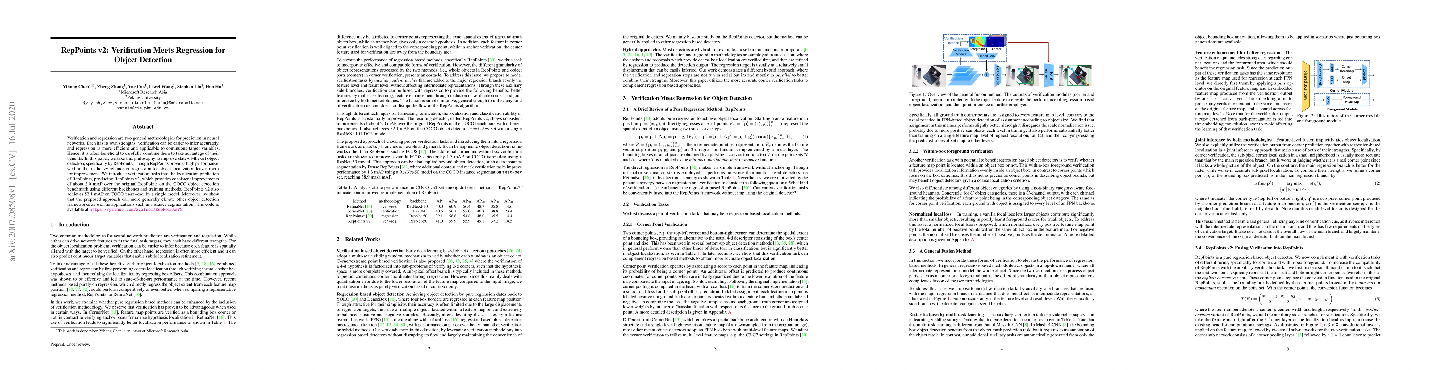 This paper proposes RepPoints v2, an enhanced object detection framework that combines verification and regression to improve localization accuracy. The approach achieves about 2.0 mAP improvement over the original RepPoints on COCO, reaching 52.1 mAP on COCO test-dev, and also elevates other detection frameworks and instance segmentation.