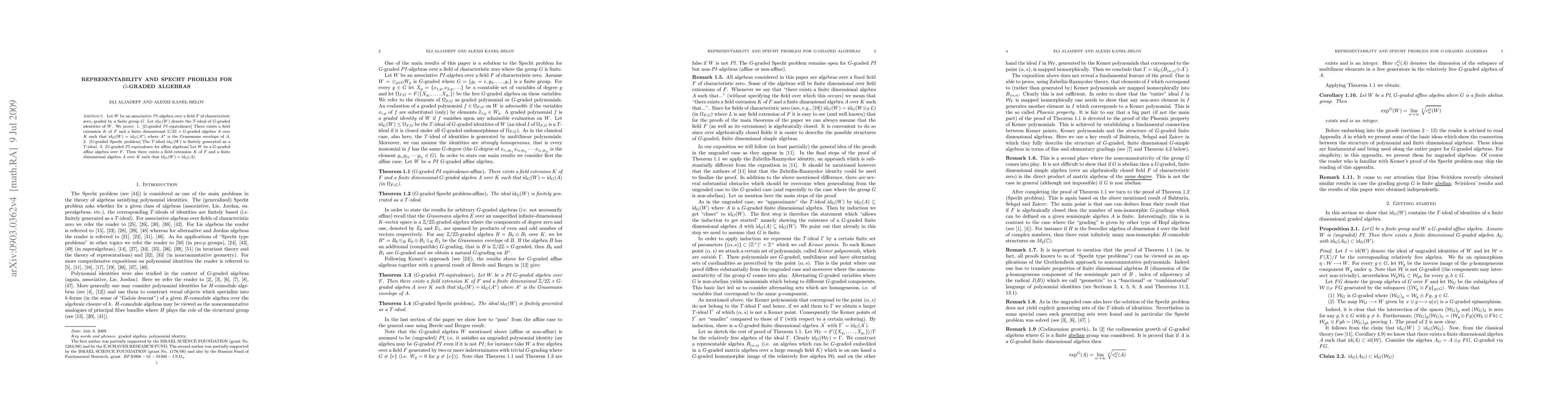 Let W be an associative PI algebra over a field F of characteristic zero, graded by a finite group G. Let id_{G}(W) denote the T-ideal of G-graded identities of W. We prove: 1. {[G-graded PI equivalence]} There exists a field extension K of F and a finite dimensional Z/2ZxG-graded algebra A over K such that id_{G}(W)=id_{G}(A^{*}) where A^{*} is the Grassmann envelope of A. 2. {[G-graded Specht problem]} The T-ideal id_{G}(W) is finitely generated as a T-ideal. 3. {[G-graded PI-equivalence for affine algebras]} Let W be a G-graded affine algebra over F. Then there exists a field extension K of F and a finite dimensional algebra A over K such that id_{G}(W)=id_{G}(A).