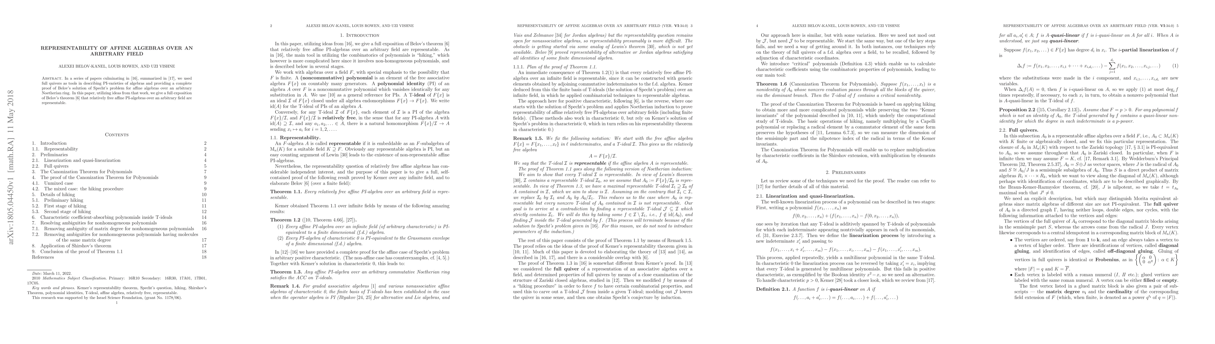 In a series of papers, we used full quivers as tools in describing PI-varieties of algebras and providing a complete proof of Belov's solution of Specht's problem for affine algebras over an arbitrary Noetherian ring. In this paper, utilizing ideas from that work, we give a full exposition of Belov's theorem that relatively free affine PI-algebras over an arbitrary field are representable. (Kemer proved the theorem over an infinite field.)