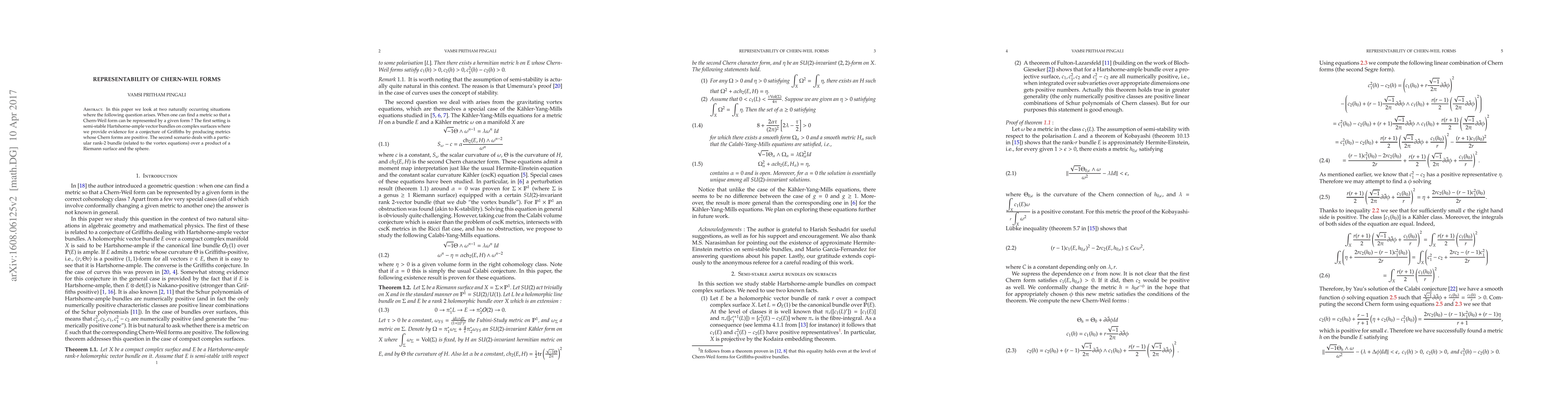 This paper investigates conditions under which Chern-Weil forms can be represented by given forms, focusing on semi-stable vector bundles on complex surfaces and a rank-2 bundle related to vortex equations, providing metrics that validate a Griffiths conjecture and demonstrating relevant metrics in both settings.
