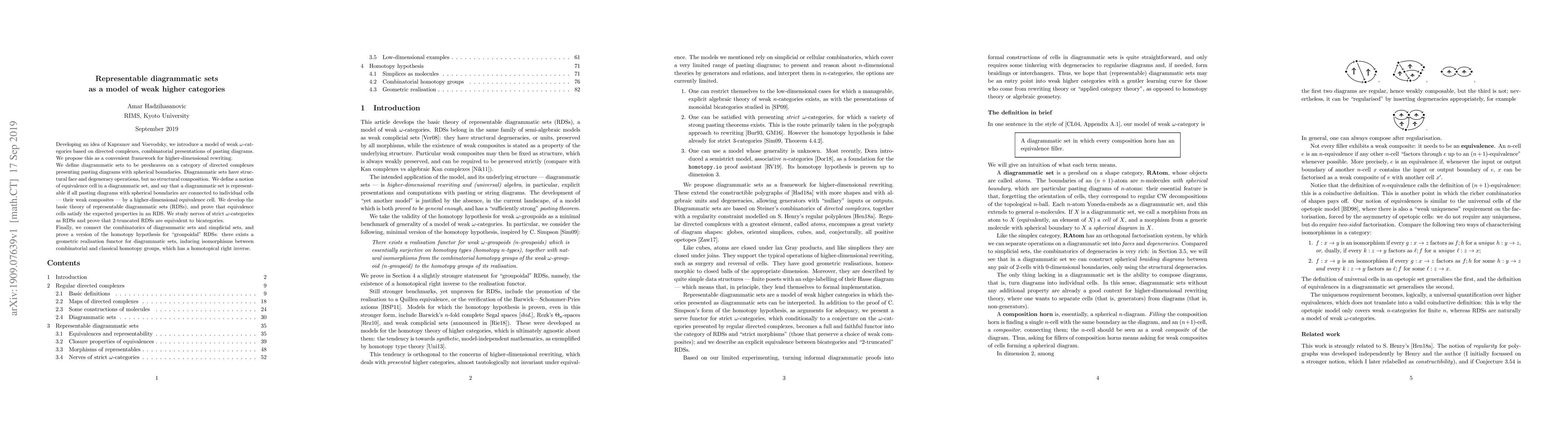 This paper introduces a model of weak higher categories using diagrammatic sets based on directed complexes and pasting diagrams. The authors define representable diagrammatic sets, prove their basic properties, and establish equivalence between 2-truncated diagrammatic sets and bicategories, concluding with a homotopy hypothesis linking diagrammatic sets and classical homotopy groups.