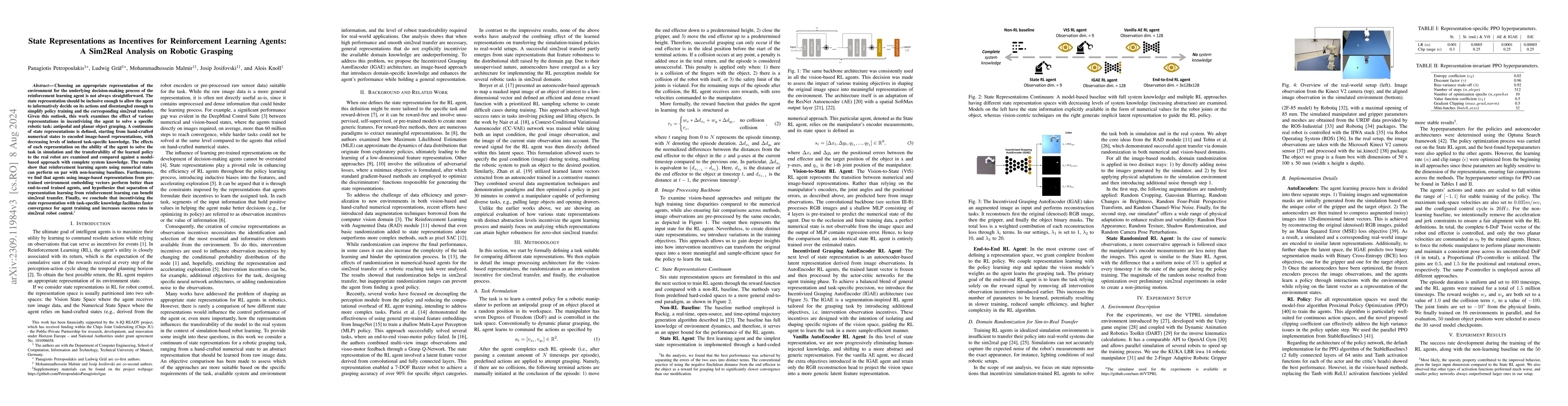 Choosing an appropriate representation of the environment for the underlying decision-making process of the RL agent is not always straightforward. The state representation should be inclusive enough to allow the agent to informatively decide on its actions and compact enough to increase sample efficiency for policy training. Given this outlook, this work examines the effect of various state representations in incentivizing the agent to solve a specific robotic task: antipodal and planar object grasping. A continuum of state representation abstractions is defined, starting from a model-based approach with complete system knowledge, through hand-crafted numerical, to image-based representations with decreasing level of induced task-specific knowledge. We examine the effects of each representation in the ability of the agent to solve the task in simulation and the transferability of the learned policy to the real robot. The results show that RL agents using numerical states can perform on par with non-learning baselines. Furthermore, we find that agents using image-based representations from pre-trained environment embedding vectors perform better than end-to-end trained agents, and hypothesize that task-specific knowledge is necessary for achieving convergence and high success rates in robot control.
