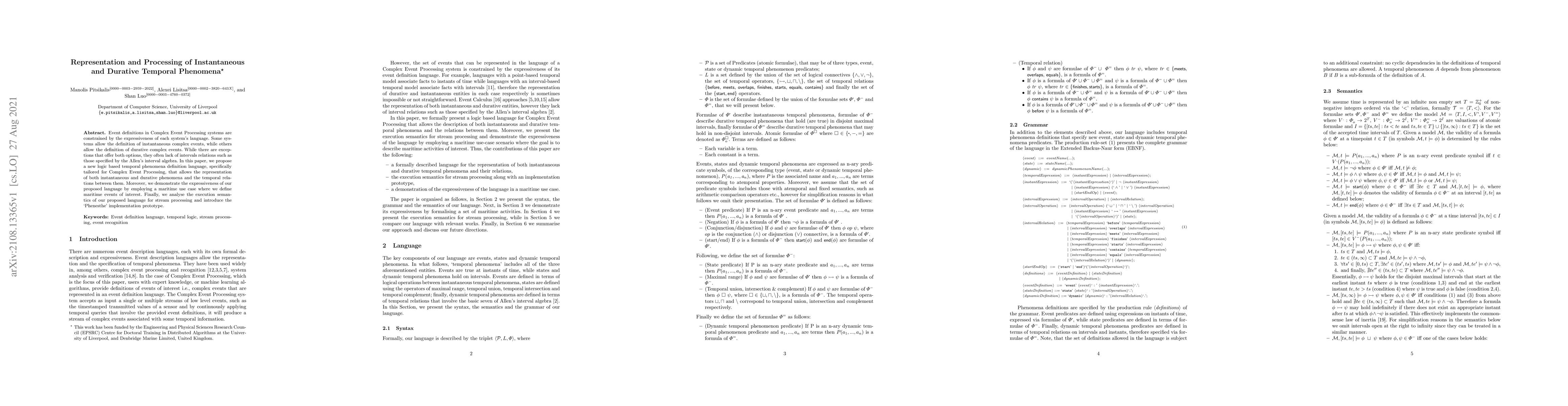 Event definitions in Complex Event Processing systems are constrained by the expressiveness of each system's language. Some systems allow the definition of instantaneous complex events, while others allow the definition of durative complex events. While there are exceptions that offer both options, they often lack of intervals relations such as those specified by the Allen's interval algebra. In this paper, we propose a new logic based temporal phenomena definition language, specifically tailored for Complex Event Processing, that allows the representation of both instantaneous and durative phenomena and the temporal relations between them. Moreover, we demonstrate the expressiveness of our proposed language by employing a maritime use case where we define maritime events of interest. Finally, we analyse the execution semantics of our proposed language for stream processing and introduce the `Phenesthe' implementation prototype.