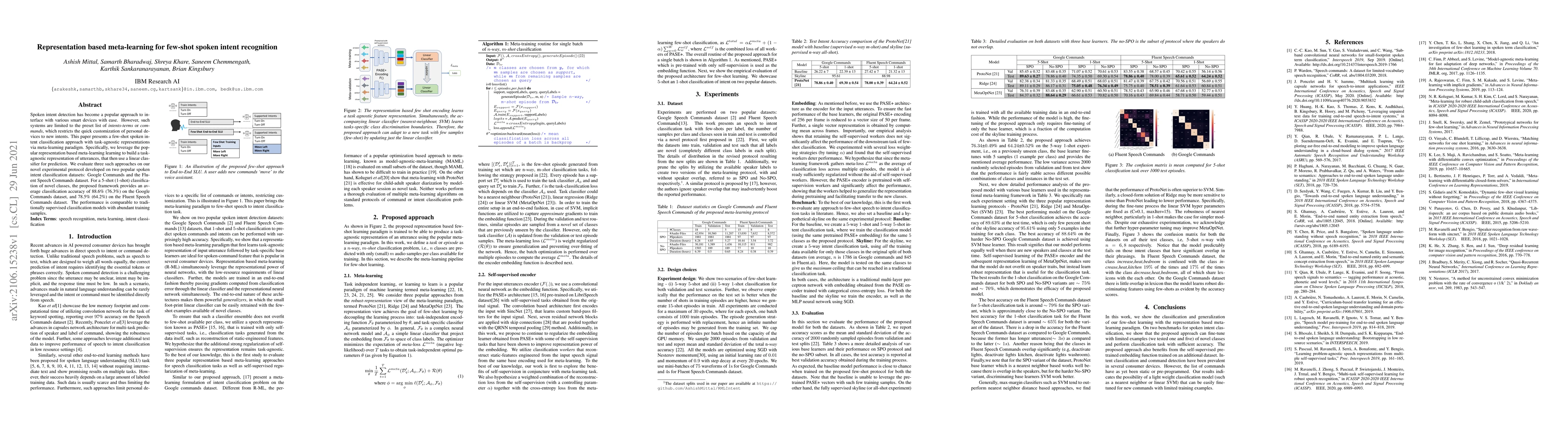 This paper introduces a few-shot spoken intent recognition method using representation-based meta-learning to create task-agnostic representations for novel intents, achieving high accuracy comparable to traditional models on Google Commands and Fluent Speech Commands datasets.
