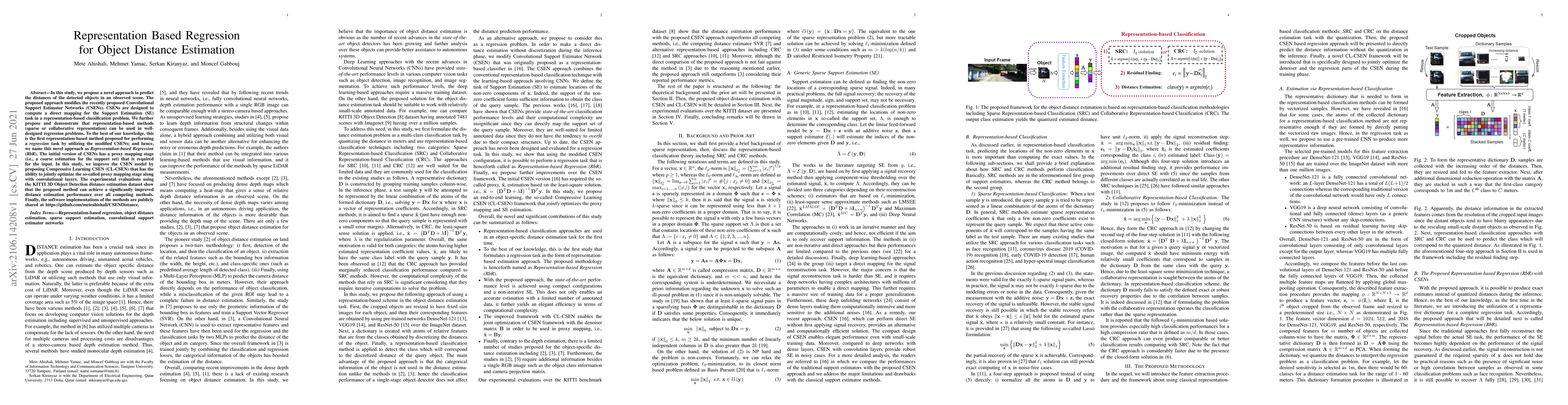 This paper proposes a novel Representation-based Regression (RbR) approach for estimating object distances using modified Convolutional Support Estimator Networks (CSENs). The Compressive Learning CSEN (CL-CSEN) improves distance estimation performance significantly over competing methods, as demonstrated on the KITTI dataset.