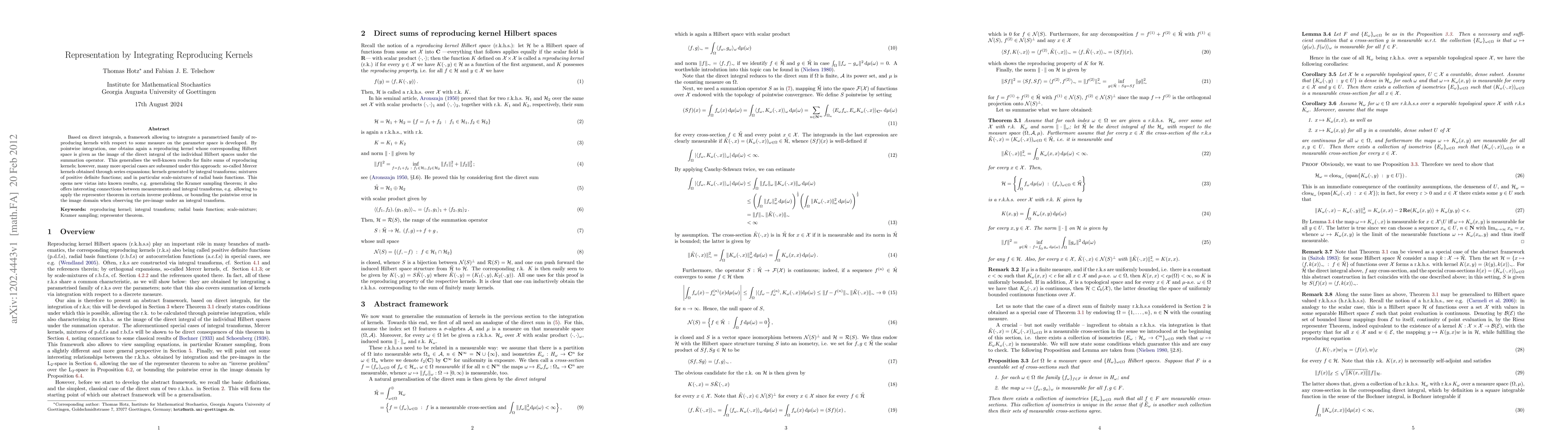 Based on direct integrals, a framework allowing to integrate a parametrised family of reproducing kernels with respect to some measure on the parameter space is developed. By pointwise integration, one obtains again a reproducing kernel whose corresponding Hilbert space is given as the image of the direct integral of the individual Hilbert spaces under the summation operator. This generalises the well-known results for finite sums of reproducing kernels; however, many more special cases are subsumed under this approach: so-called Mercer kernels obtained through series expansions; kernels generated by integral transforms; mixtures of positive definite functions; and in particular scale-mixtures of radial basis functions. This opens new vistas into known results, e.g. generalising the Kramer sampling theorem; it also offers interesting connections between measurements and integral transforms, e.g. allowing to apply the representer theorem in certain inverse problems, or bounding the pointwise error in the image domain when observing the pre-image under an integral transform.