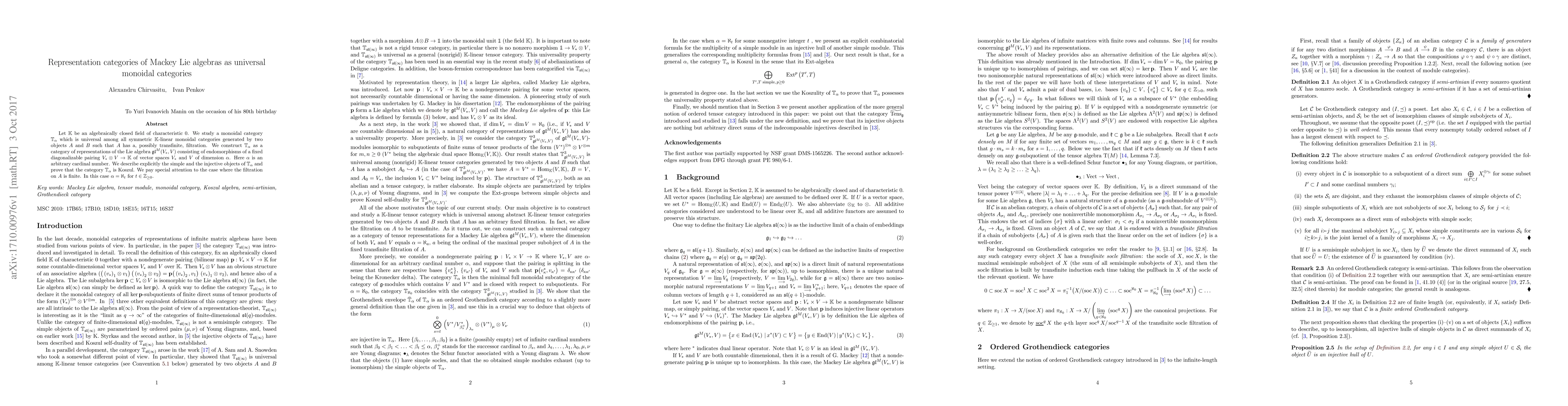 Let $\mathbb{K}$ be an algebraically closed field of characteristic $0$. We study a monoidal category $\mathbb{T}_\alpha$ which is universal among all symmetric $\mathbb{K}$-linear monoidal categories generated by two objects $A$ and $B$ such that $A$ has a, possibly transfinite, filtration. We construct $\mathbb{T}_\alpha$ as a category of representations of the Lie algebra $\mathfrak{gl}^M(V_*,V)$ consisting of endomorphisms of a fixed diagonalizable pairing $V_*\otimes V\to \mathbb{K}$ of vector spaces $V_*$ and $V$ of dimension $\alpha$. Here $\alpha$ is an arbitrary cardinal number. We describe explicitly the simple and the injective objects of $\mathbb{T}_\alpha$ and prove that the category $\mathbb{T}_\alpha$ is Koszul. We pay special attention to the case where the filtration on $A$ is finite. In this case $\alpha=\aleph_t$ for $t\in\mathbb{Z}_{\geq 0}$.