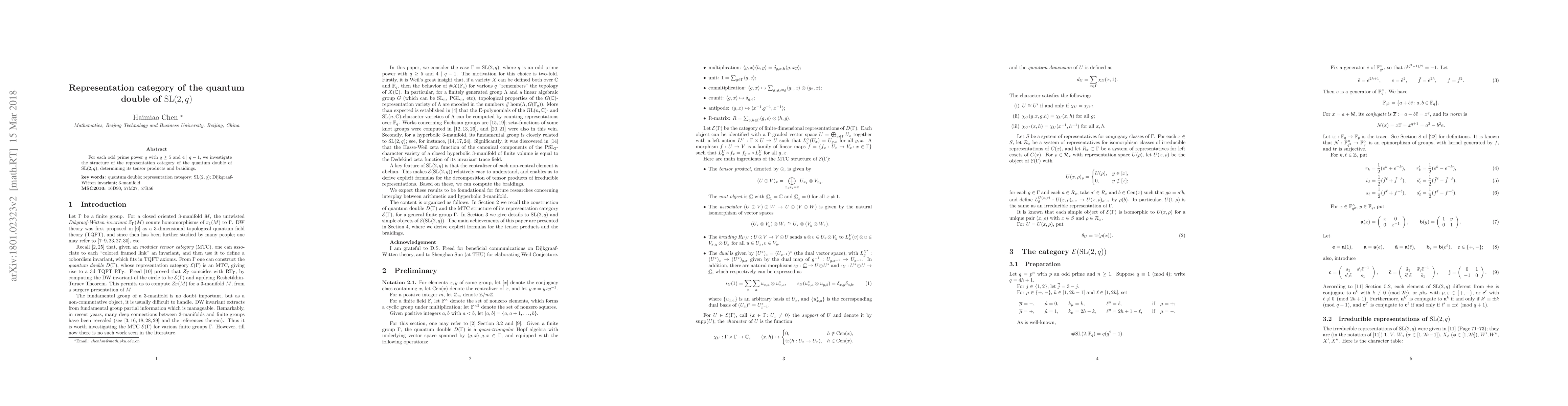 For each odd prime power $q$ with $q\ge 5$ and $4\mid q-1$, we investigate the structure of the representation category of the quantum double of ${\rm SL}(2,q)$, determining its tensor products and braidings.