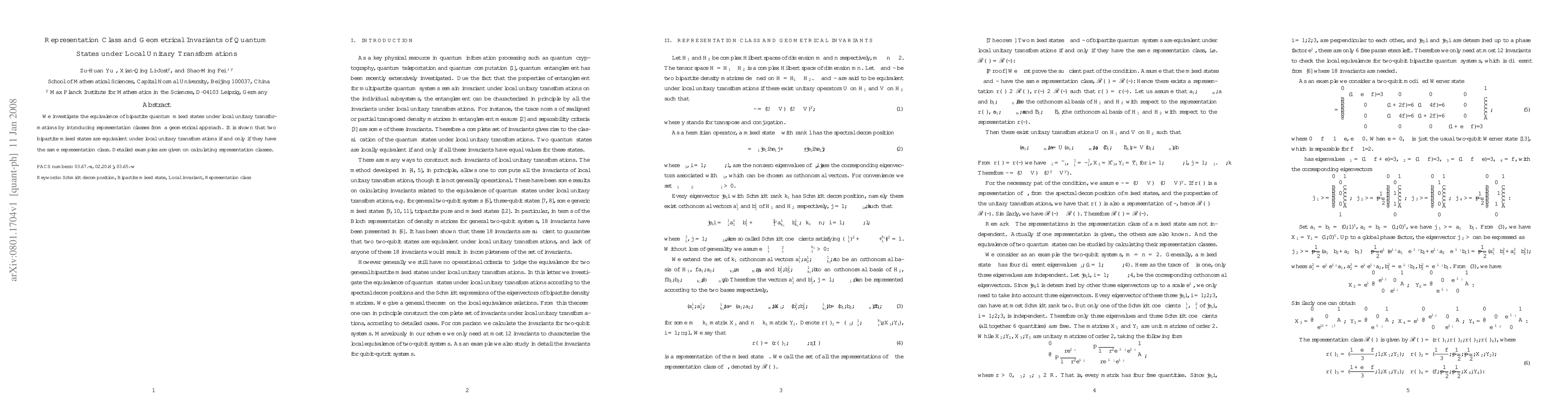 We investigate the equivalence of bipartite quantum mixed states under local unitary transformations by introducing representation classes from a geometrical approach. It is shown that two bipartite mixed states are equivalent under local unitary transformations if and only if they have the same representation class. Detailed examples are given on calculating representation classes.