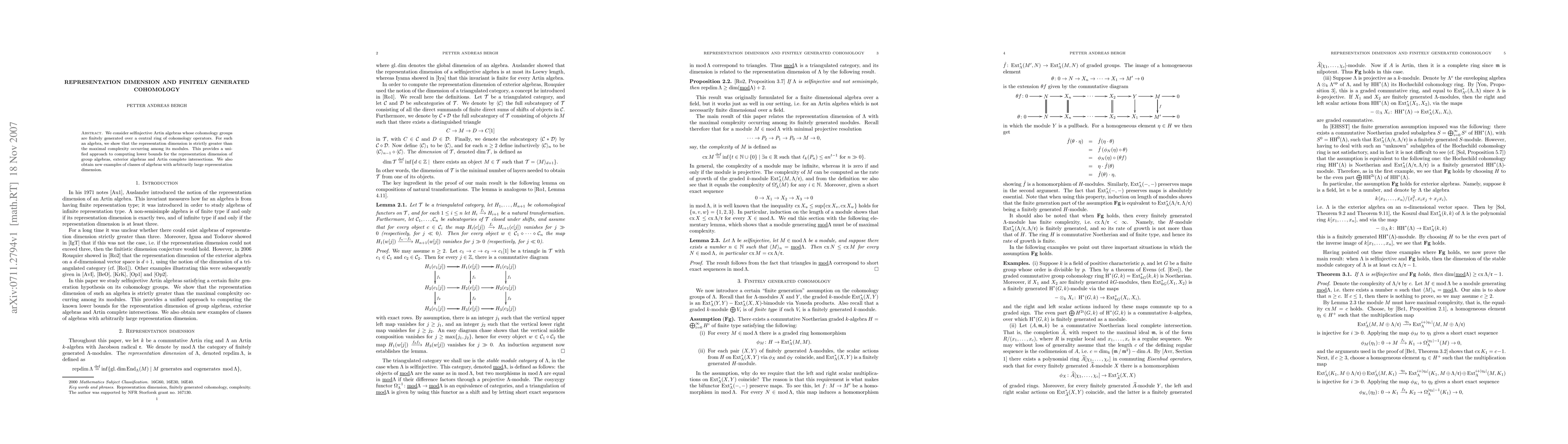 We consider selfinjective Artin algebras whose cohomology groups are finitely generated over a central ring of cohomology operators. For such an algebra, we show that the representation dimension is strictly greater than the maximal complexity occurring among its modules. This provides a unified approach to computing lower bounds for the representation dimension of group algebras, exterior algebras and Artin complete intersections. We also obtain new examples of classes of algebras with arbitrarily large representation dimension.