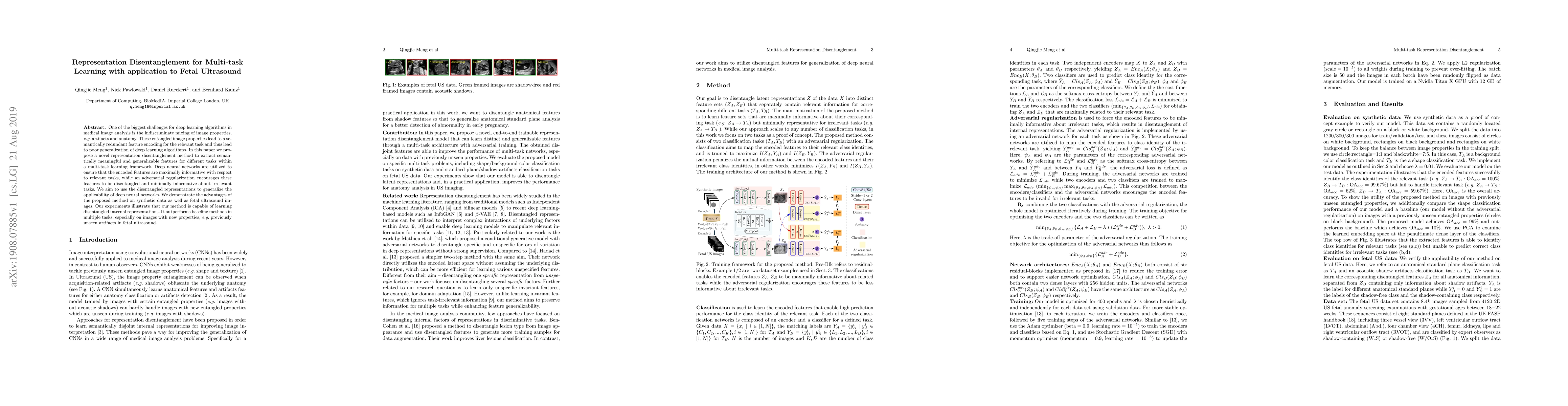 One of the biggest challenges for deep learning algorithms in medical image analysis is the indiscriminate mixing of image properties, e.g. artifacts and anatomy. These entangled image properties lead to a semantically redundant feature encoding for the relevant task and thus lead to poor generalization of deep learning algorithms. In this paper we propose a novel representation disentanglement method to extract semantically meaningful and generalizable features for different tasks within a multi-task learning framework. Deep neural networks are utilized to ensure that the encoded features are maximally informative with respect to relevant tasks, while an adversarial regularization encourages these features to be disentangled and minimally informative about irrelevant tasks. We aim to use the disentangled representations to generalize the applicability of deep neural networks. We demonstrate the advantages of the proposed method on synthetic data as well as fetal ultrasound images. Our experiments illustrate that our method is capable of learning disentangled internal representations. It outperforms baseline methods in multiple tasks, especially on images with new properties, e.g. previously unseen artifacts in fetal ultrasound.